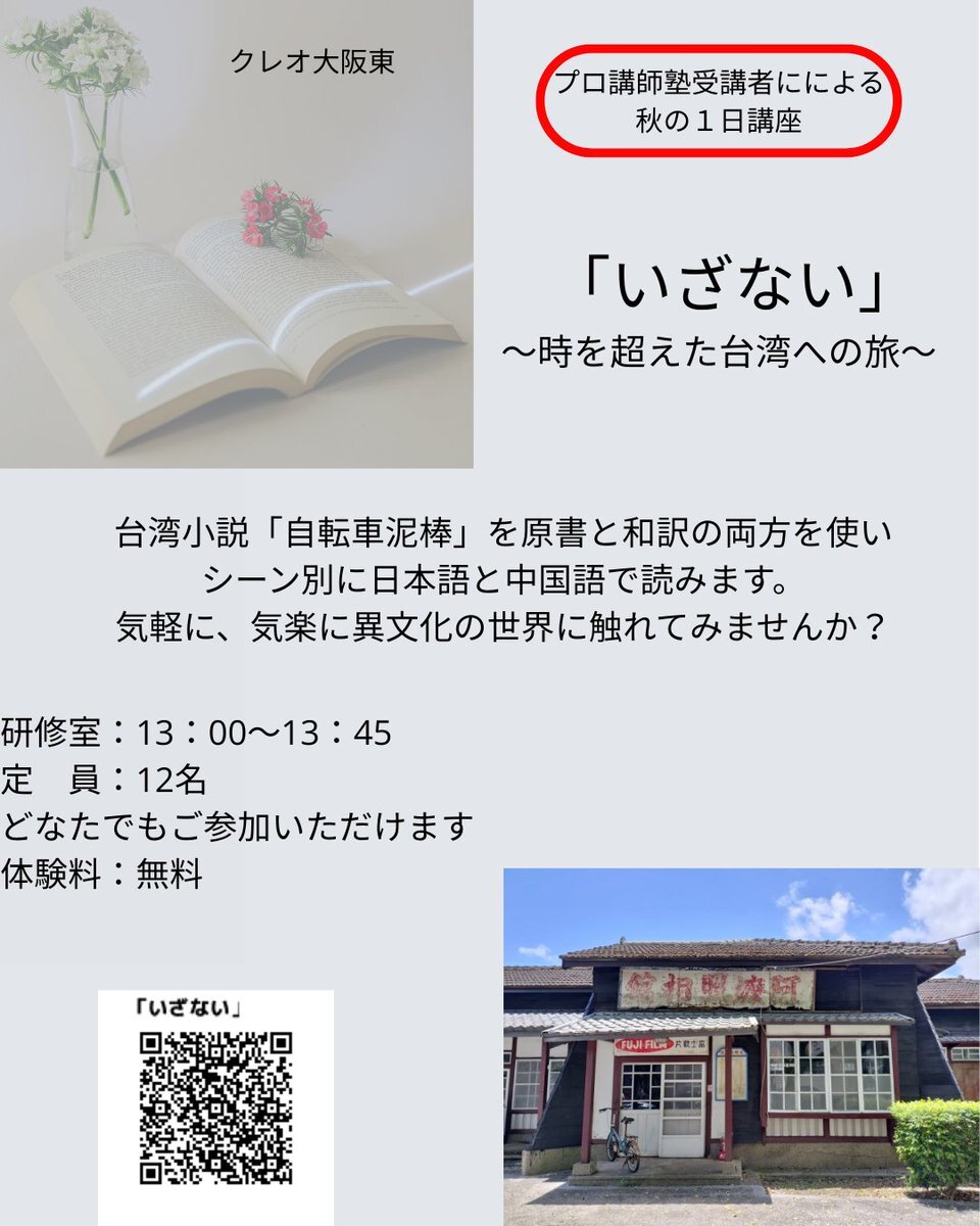 『秋の1日講座byプレ「プロ講師」』開催! 講師の卵さんたちが、自分の想いをお伝えします! ★「いざない」 ~時を超えた台湾への旅~ ナビゲーターはれんさんです。 #1日講座 #異文化 #台湾小説 #クレオ大阪東 #プロ講師になろう塾 #講師の卵 #城東区 #京橋 #OBP #森ノ宮キャンパス近く pic.x.com/RyfEGMOMVn