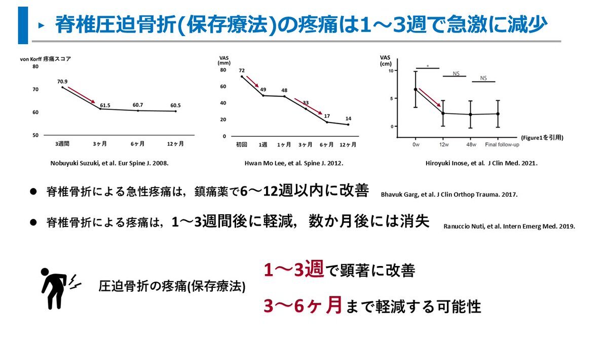 脊椎圧迫骨折(VCF)の疼痛💡 1〜3週で急激に減少する❗️ 関連する文献抄読を共有ᯤ VCF× ■前後の姿勢変化:note.com/super_human/n/… ■保存療法のコンセンサス:note.com/super_human/n/… ■歩行自立の臨床予測ルール:note.com/super_human/n/… 疼痛経過の特徴は把握したいですね😲 #圧迫骨折 #疼痛 pic.x.com/mXTOQ7bHAQ x.com/pt_inakano/sta…