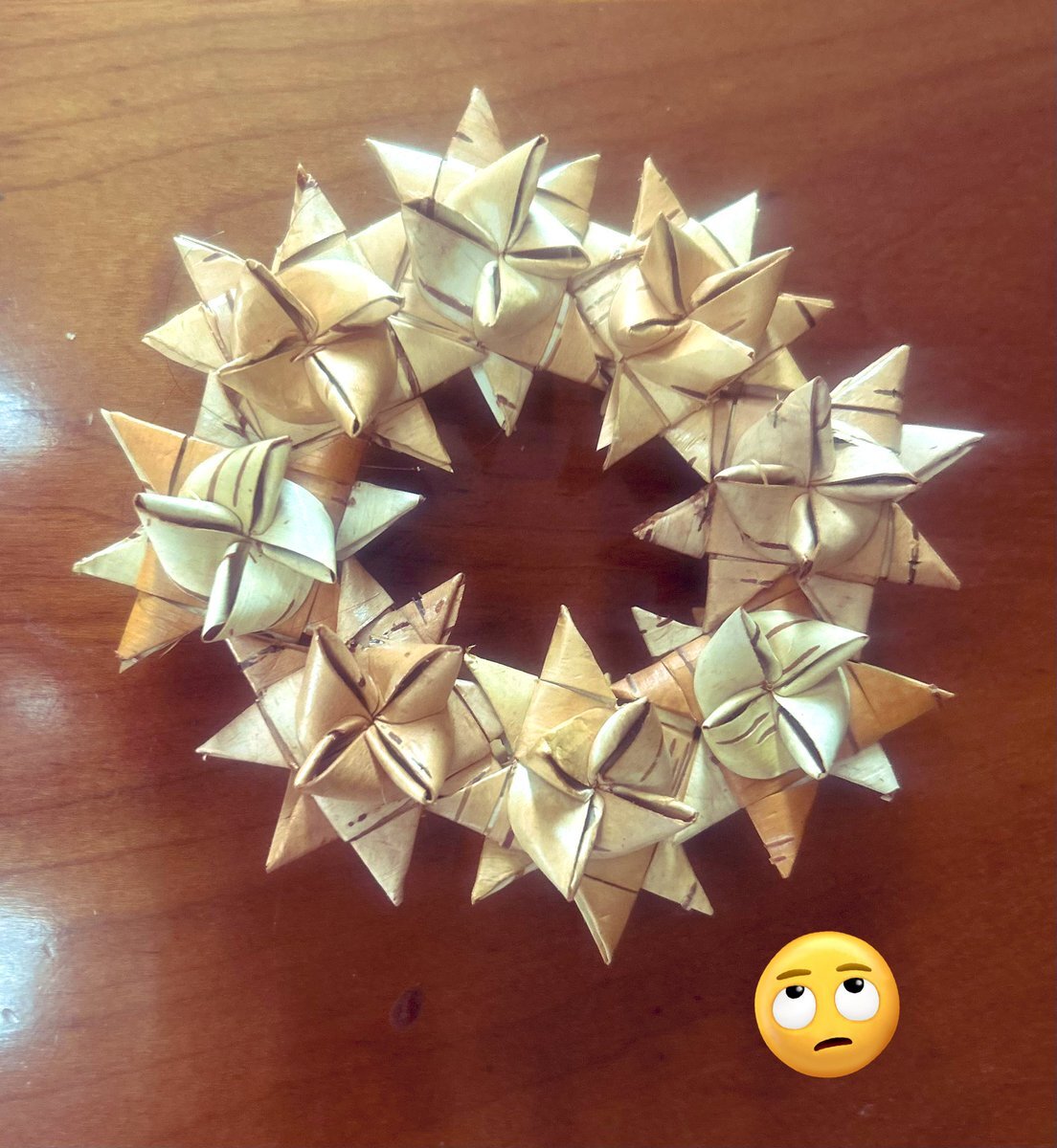 夜な夜な 完成したけど やはり3枚皮じゃ 綺麗にならんなぁ… 勿体なくて、捨てられない樹皮 どうしたもんか悩む🤔 #白樺細工 #アドベントスターリース #白樺 pic.x.com/0qnuG56xw5