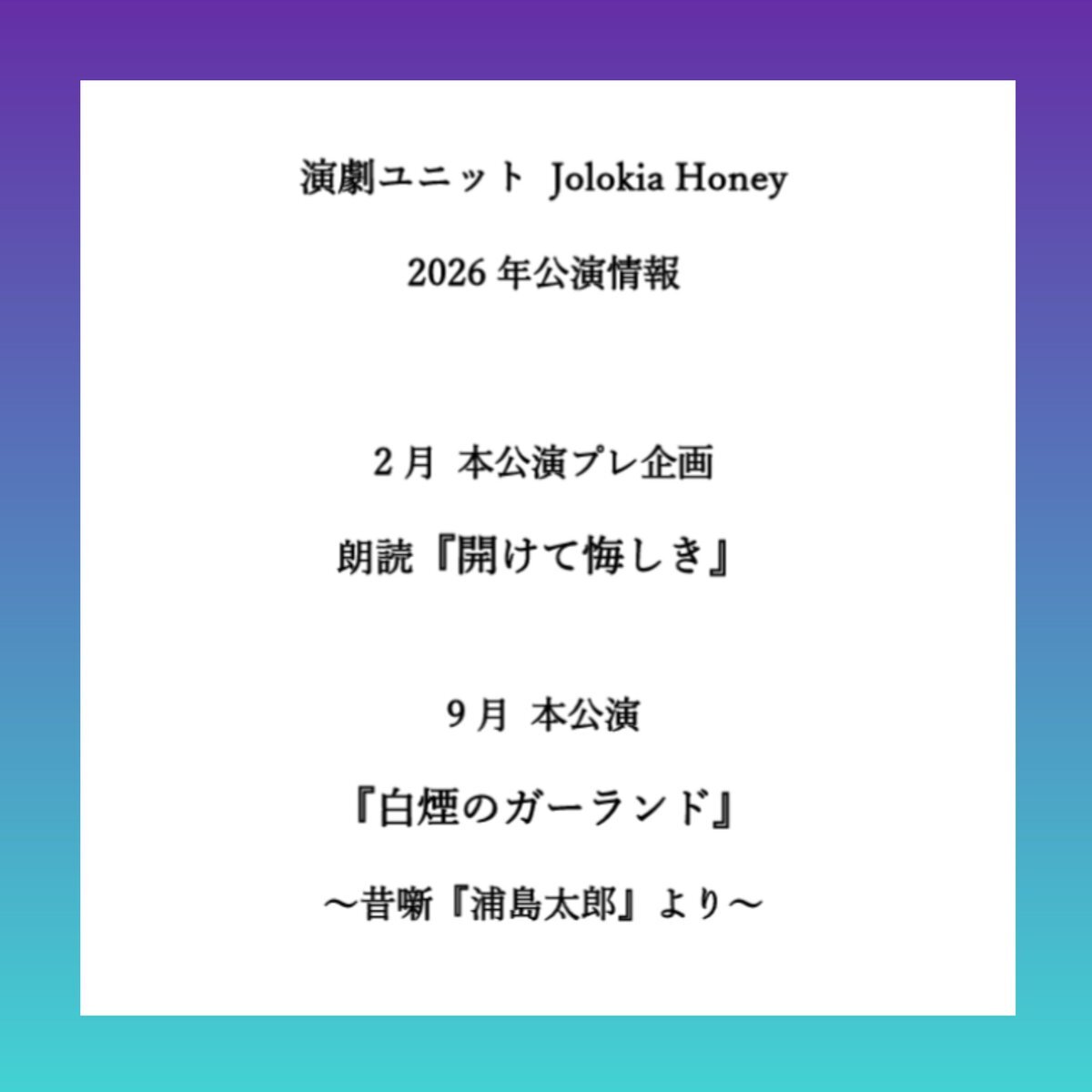 🌶️2026年 公演情報発表🐝 2026年の じょろはに は… 🐢『浦島太郎』🌊‼️ 本公演は9月予定 『白煙のガーランド』 〜昔噺『浦島太郎』より〜 それに先立ち2月にプレ企画🙌 本編と連なる 『開けて悔しき』 を朗読公演します✨ お楽しみに‼️ 続報をお待ちください🌶️🐝 #白煙 #あけくや #じょろはに