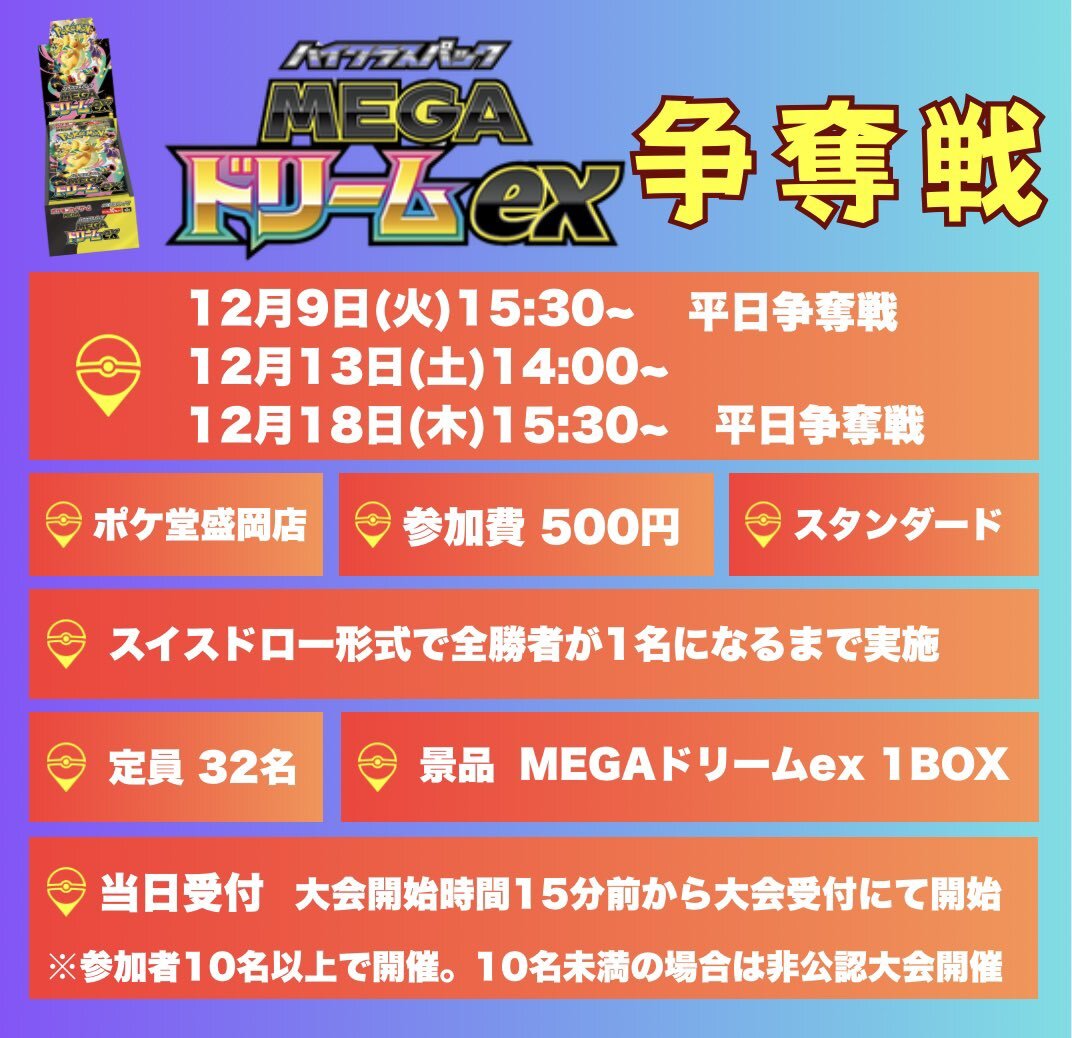 🔔イベント情報🔔 ✨MEGAドリームex争奪戦✨ 【12月8日(木)15:30〜平日争奪戦】 🔥ご参加お待ちしてます🔥 #ポケ堂 #ポケカ #盛岡 #イベント #MEGAドリームex pic.x.com/0oXuBJtaaw