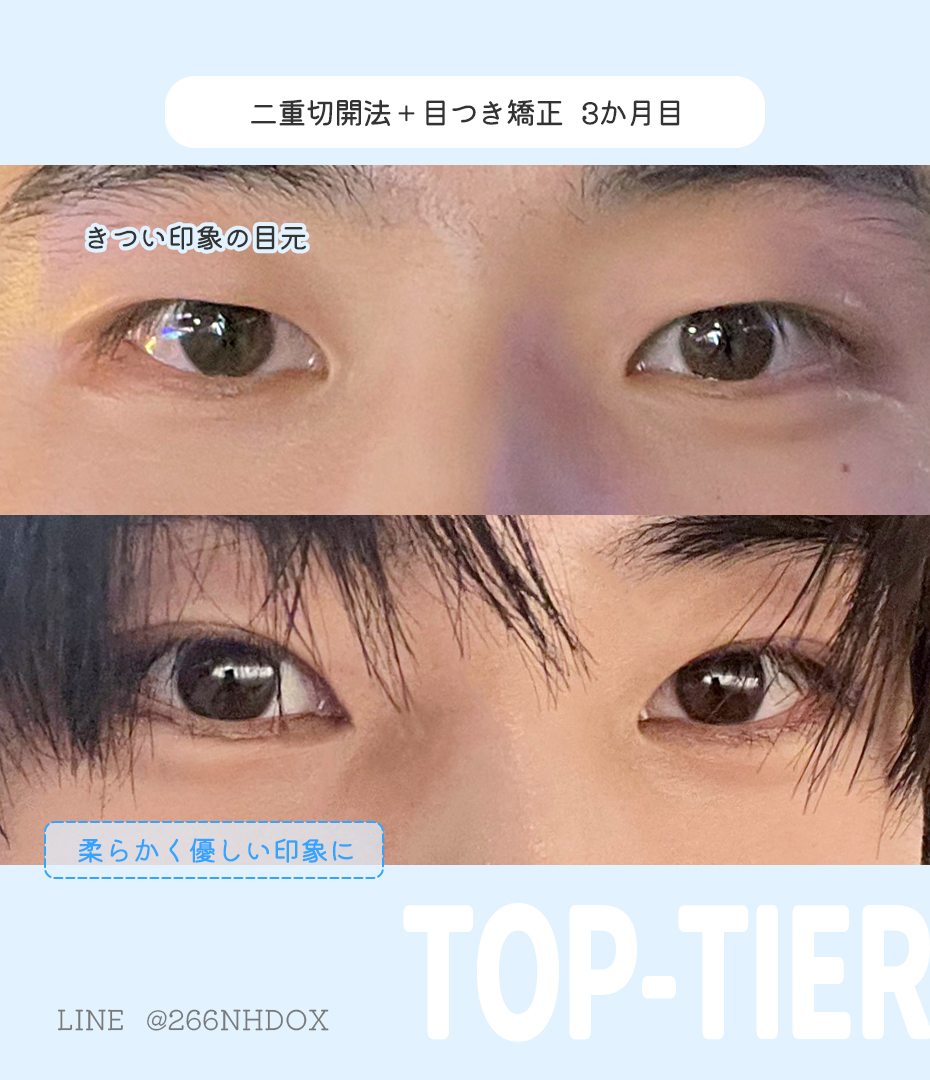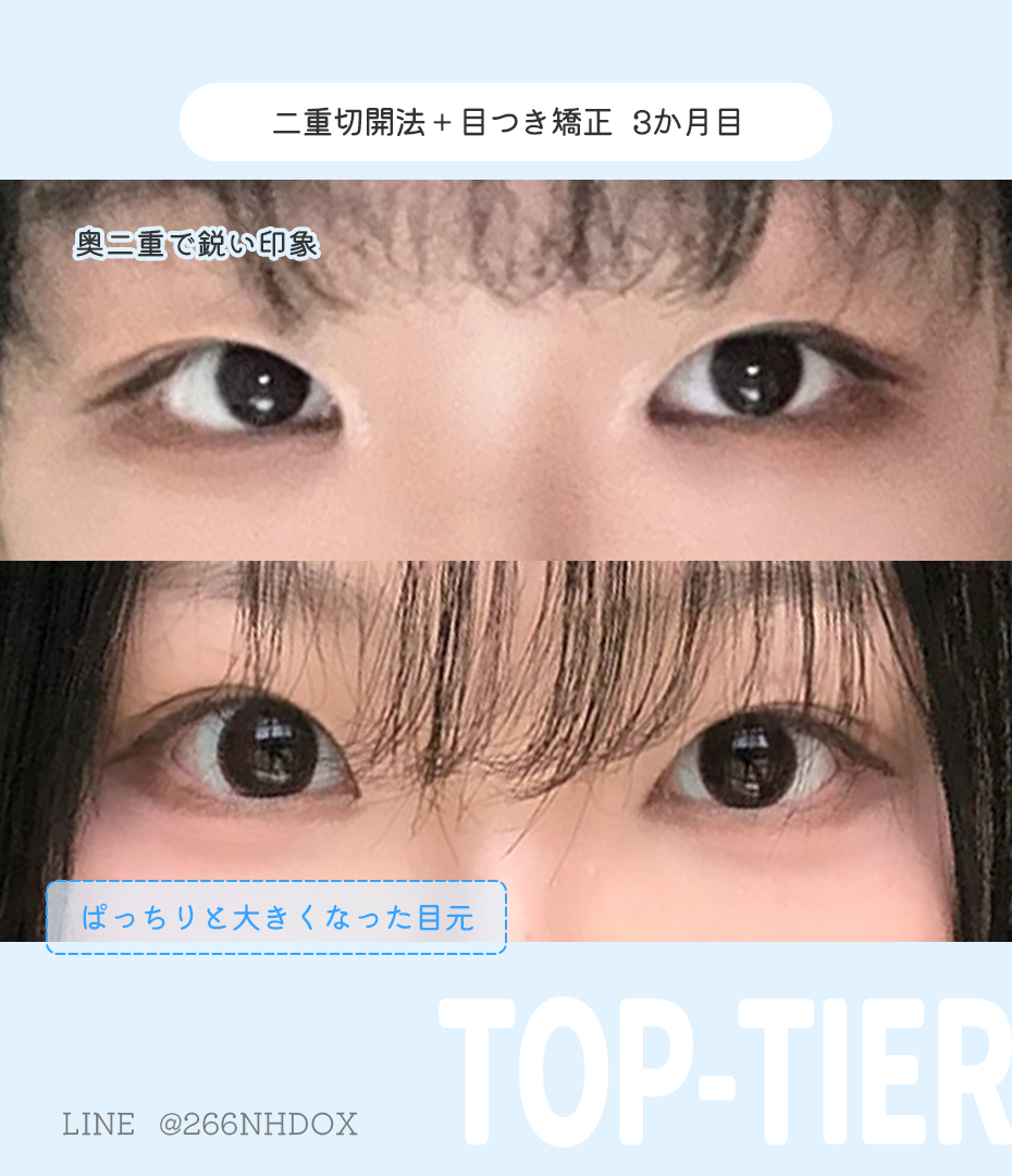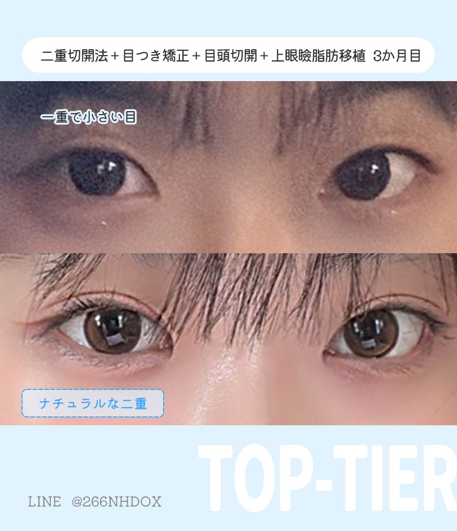 #二重切開法+#目つき矯正+#目頭切開+#上眼瞼脂肪移植 【3ヶ月】 💌お悩み ⇒一重で小さい目 悩みだった一重が、ぱっちりした目になって感動です❤🤩 自然な仕上がりにしてくださいって伝えてたけど ほんとに自然できれいなラインを作ってくれて 腫れも思ったより早く引いて、うれしいです✨🎀 . x.com/toptier_jp/sta…