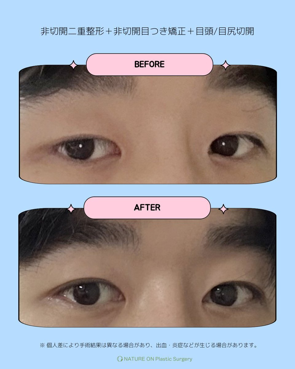 🩵ネイチャーオン整形外科 症例写真🩵 手術2週間後📸 【男性目整形】 ▸非切開二重 ▸非切開目つき矯正 ▸目頭/目尻切開 💬公式LINE:lin.ee/nv5pGGb 目整形だけで韓国アイドル風に✨ #ネイチャーオン整形外科 #クォンチャン #埋没 #二重 #目つき矯正 #目尻切開 #二重整形 #目頭切開 pic.x.com/oDPlQg0cyq