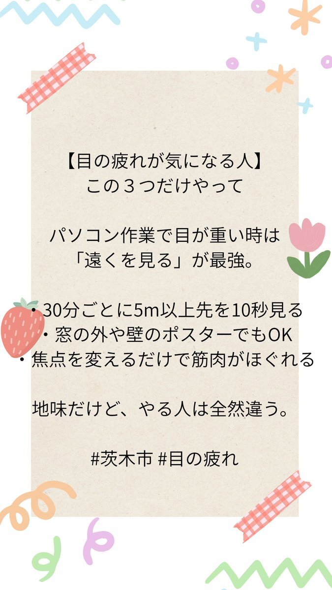 【目の疲れが気になる人】この3つだけやって パソコン作業で目が重い時は「遠くを見る」が最強。 ・30分ごとに5m以上先を10秒見る ・窓の外や壁のポスターでもOK ・焦点を変えるだけで筋肉がほぐれる 地味だけど、やる人は全然違う。 #茨木市 #目の疲れ pic.x.com/AXcYEnHqfv