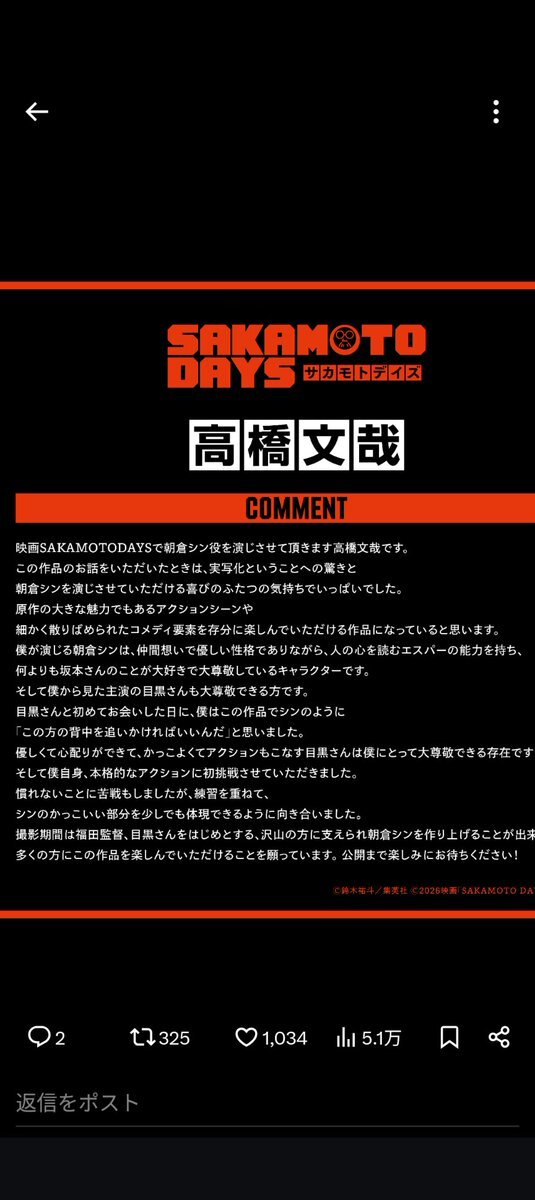アニメから出てきたまんまのシンくん そのものです! 坂本さんを尊敬して止まないシンくん そんなふたりの関係とアクションも ますます楽しみです!! #SAKAMOTODAYS #目黒蓮 #高橋文哉 x.com/skmtdays_movie…