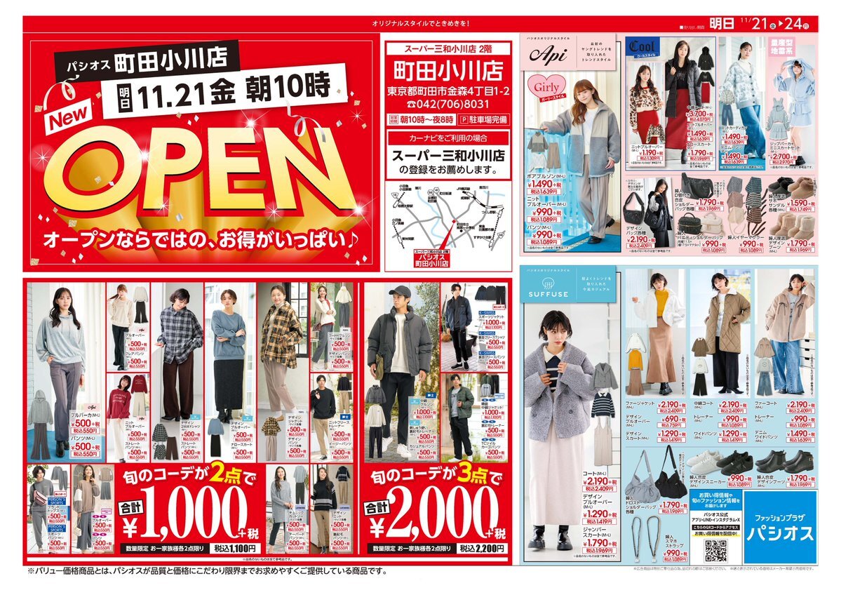 【🎊明日オープン!!🎊】 パシオス町田小川店 11月21日(金)OPEN ✨ スーパー三和町田小川店2階に出店✨✨ オープン特別チラシを実施いたしますので 、今だけの特別プライスをお見逃しなく! ▼店舗詳細ページはコチラです♪ paseos.co.jp/store/machidao… #パシオス #町田 #相模原 pic.x.com/XNXWDiE6KC