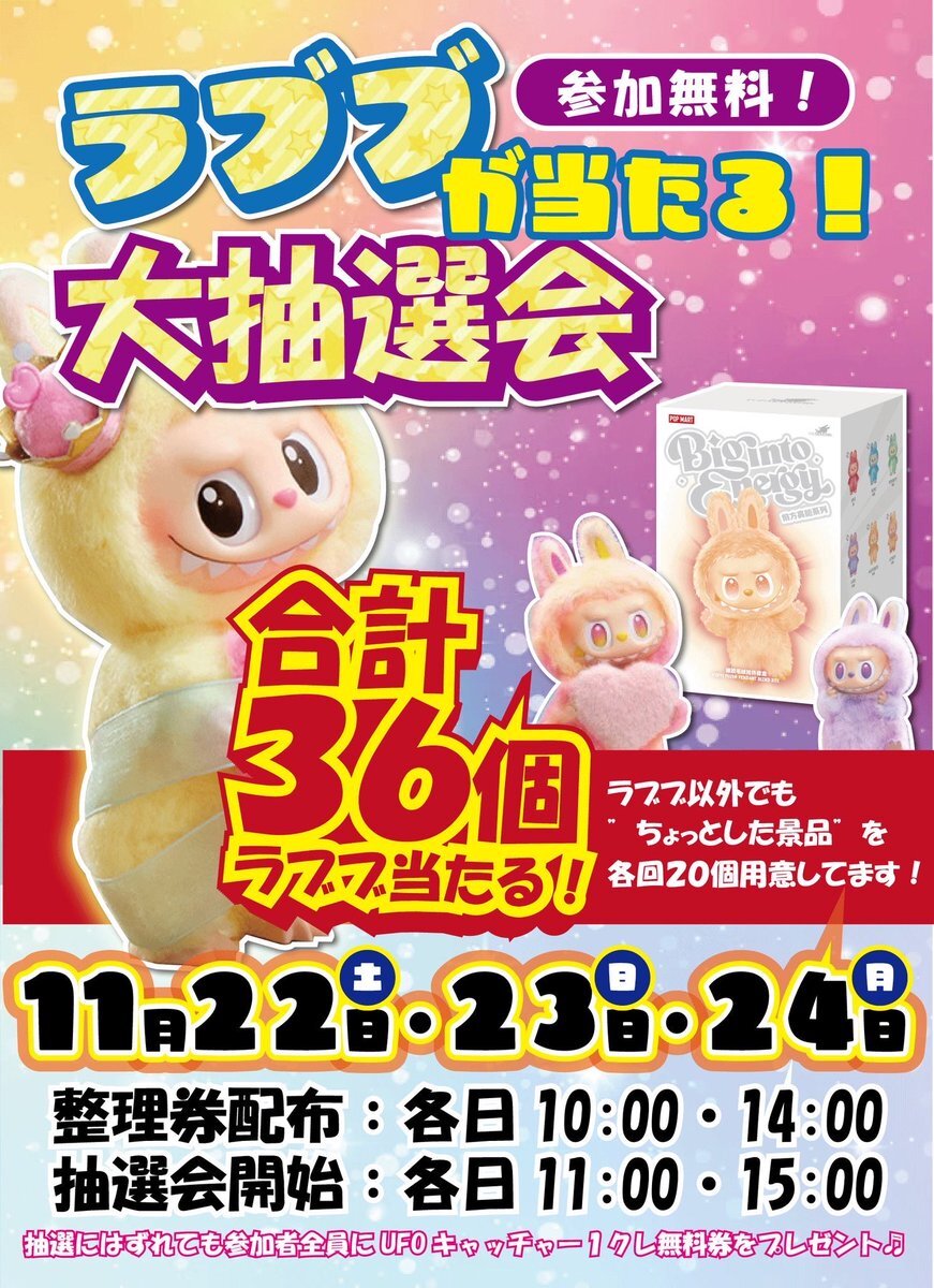 いよいよ明後日! 大人気イベント 参加無料のラブブイベント開催します! 22日〜24日3日間 10時〜整理券配布 11時〜抽選会開始 14時〜整理券配布 15時〜抽選会開始 たくさんのご参加お待ちしております! #ラブブ #イベント #八王子 #相模原 #多摩 #立川 #府中 #町田 pic.x.com/a34RHZlszF