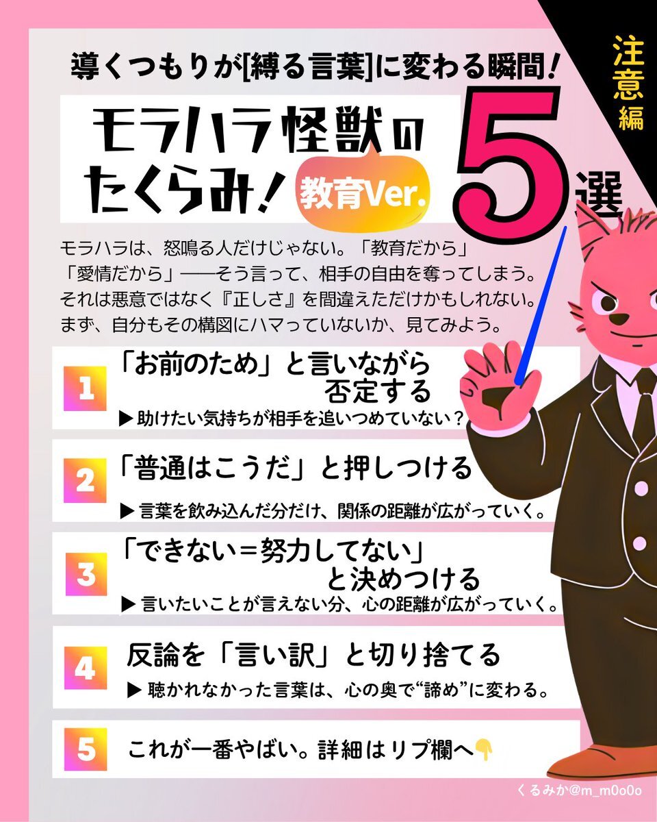 😈「なんで言われたことが できないんだ?」 😢 「……やってみたけど、 違ったみたいで」 😈「“違ったみたい”じゃなくて、 できてないんだよ」 教室の空気がピタリと止まる。 黒板のチョークの粉が、 ゆっくり宙に漂う。 😈「お前のためを思って