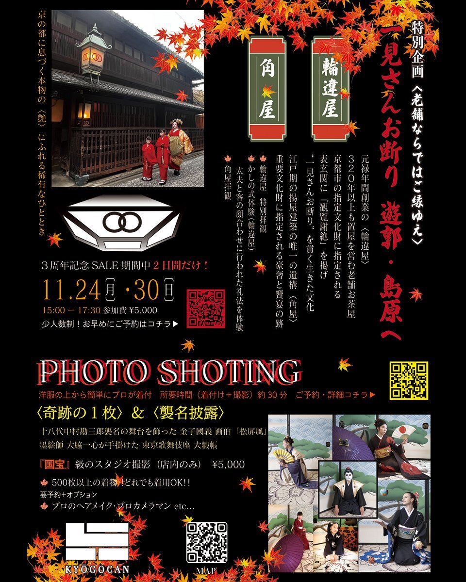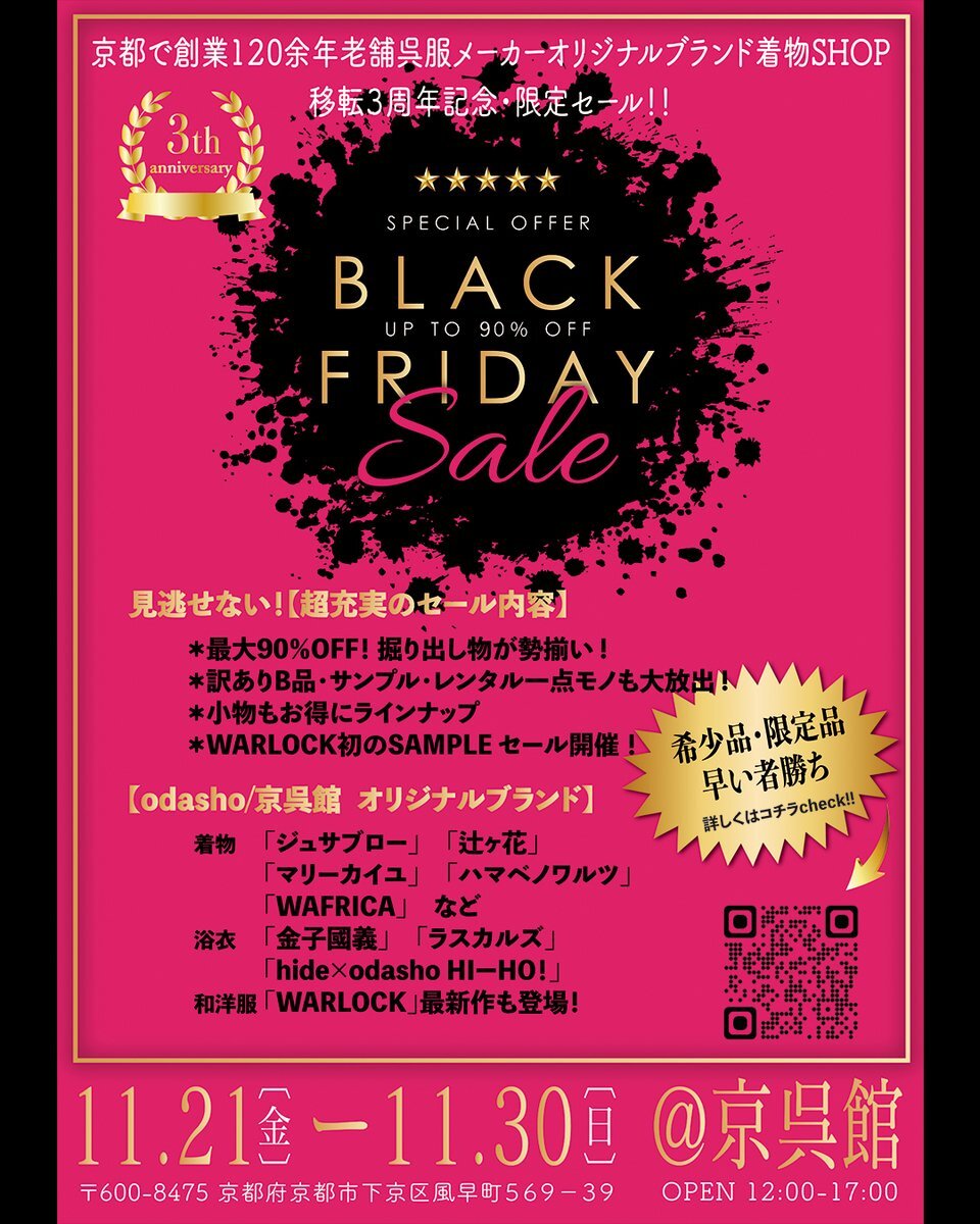 京呉館 移転3周年 感謝をこめて! 紅葉×BLACK FRIDAY 特別セール 11/21〜11/30 最大90%OFF B品・サンプル・レンタル品も大放出。 WaRLOCKー初のSAMPLEセールも同時開催。 ◆特別企画 ①島原拝観体験 ②着物体験📷 👇詳細はこちら kyogocan.net/blackfriday2025 #京呉館 #京都 #着物体験 #WaRLOCK pic.x.com/rhBZoY0PRB
