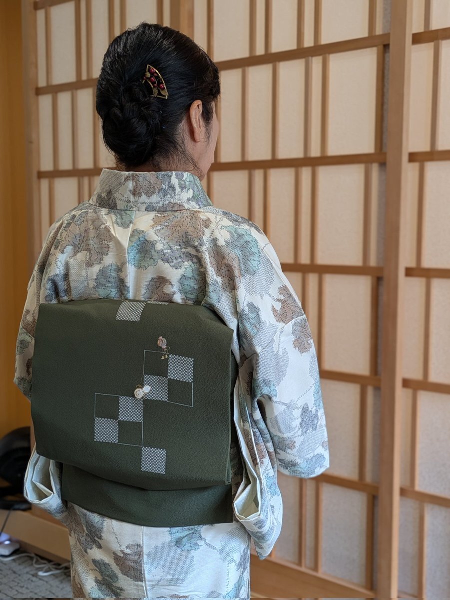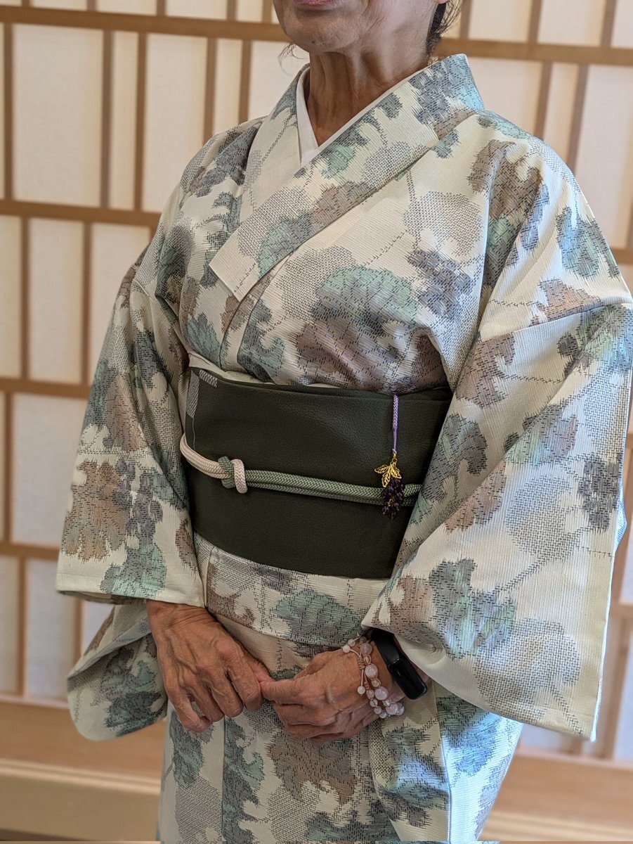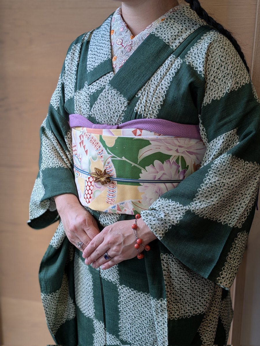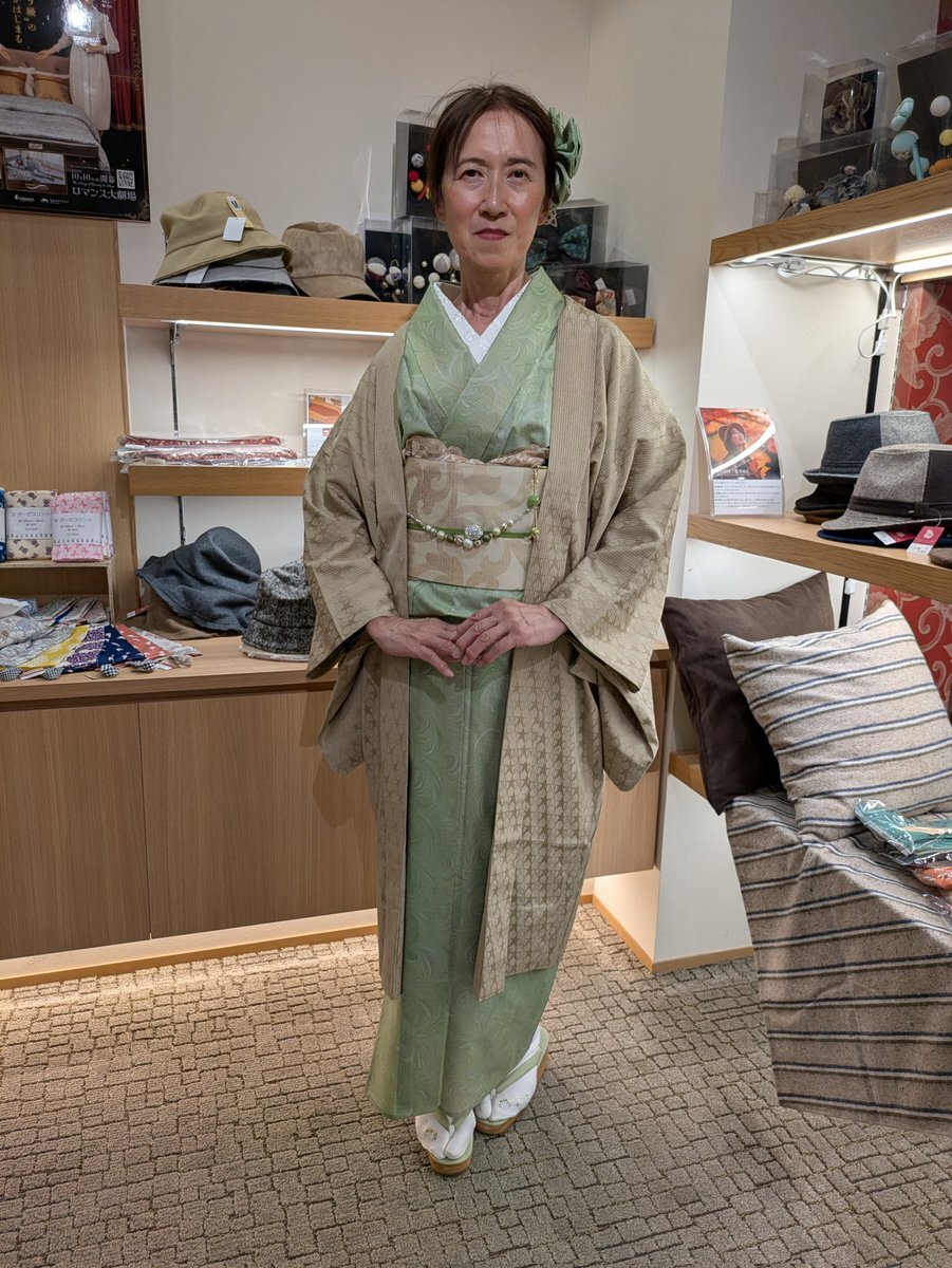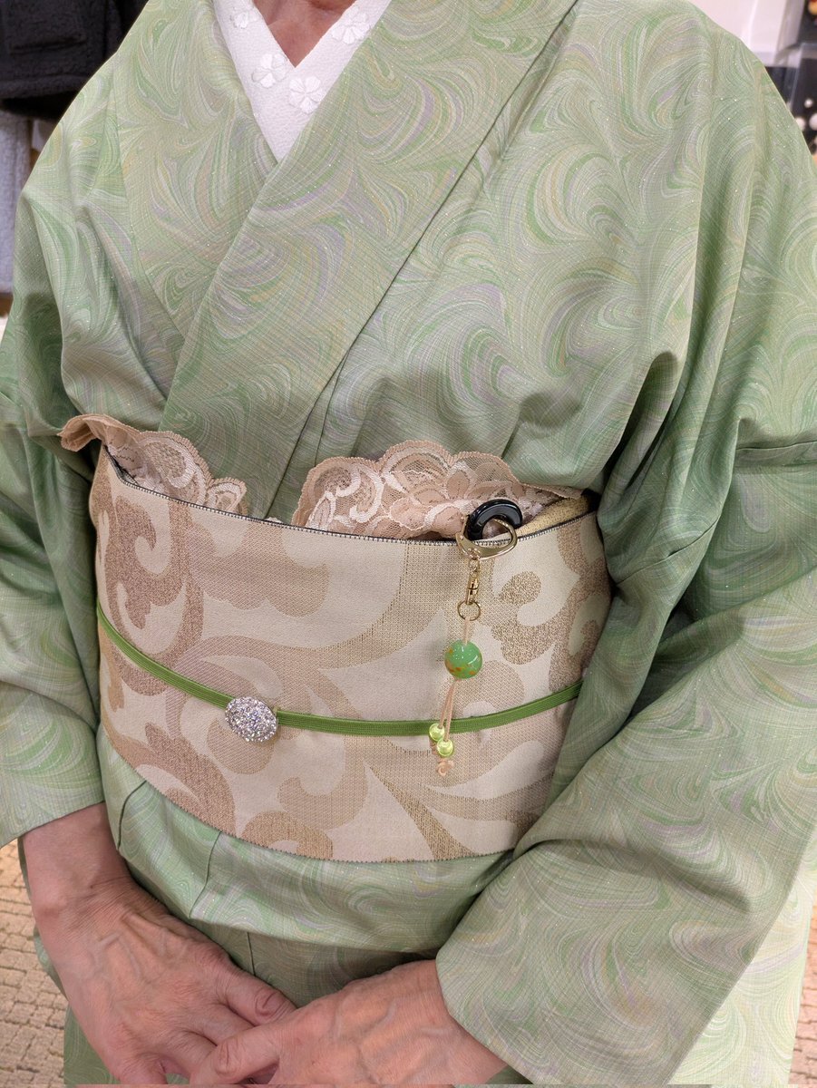 美術館帰りにお立ち寄りくださいました♪ 今日はグリーンコーデ🍋‍🟩 #帯揚げ は、レースをご自分で染められたもの #根付け のとんぼ玉もお手製 #羽織紐 はネックレスをリメイク💎 きもの姿と手作りをたのしんでおられますね☺ 素敵なコーディネートをありがとうございます😊 #着物コーデ #着物生活 pic.x.com/E4Xmd56BoG