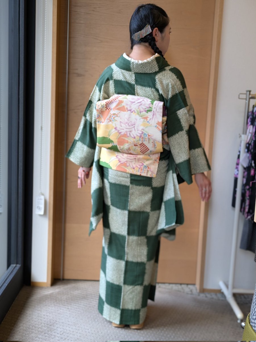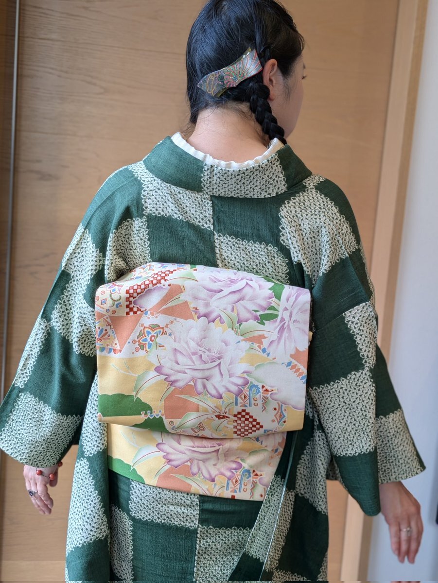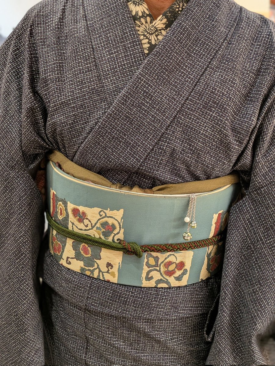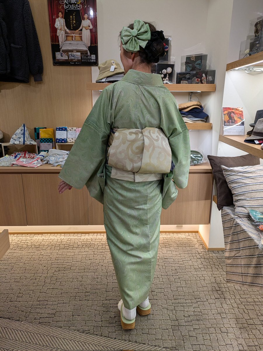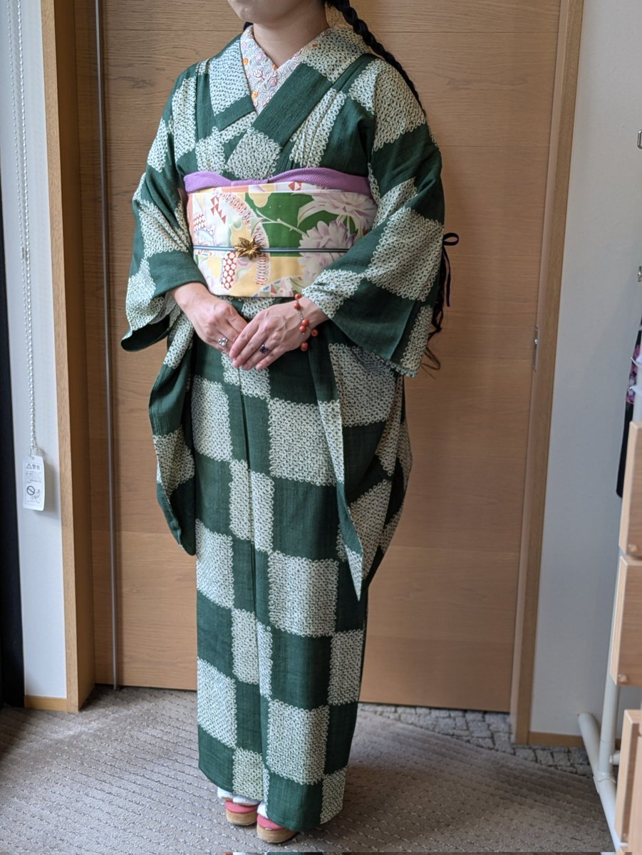 美術館帰りにお立ち寄りくださいました♪ 今日はグリーンコーデ🍋‍🟩 #帯揚げ は、レースをご自分で染められたもの #根付け のとんぼ玉もお手製 #羽織紐 はネックレスをリメイク💎 きもの姿と手作りをたのしんでおられますね☺ 素敵なコーディネートをありがとうございます😊 #着物コーデ #着物生活 pic.x.com/E4Xmd56BoG