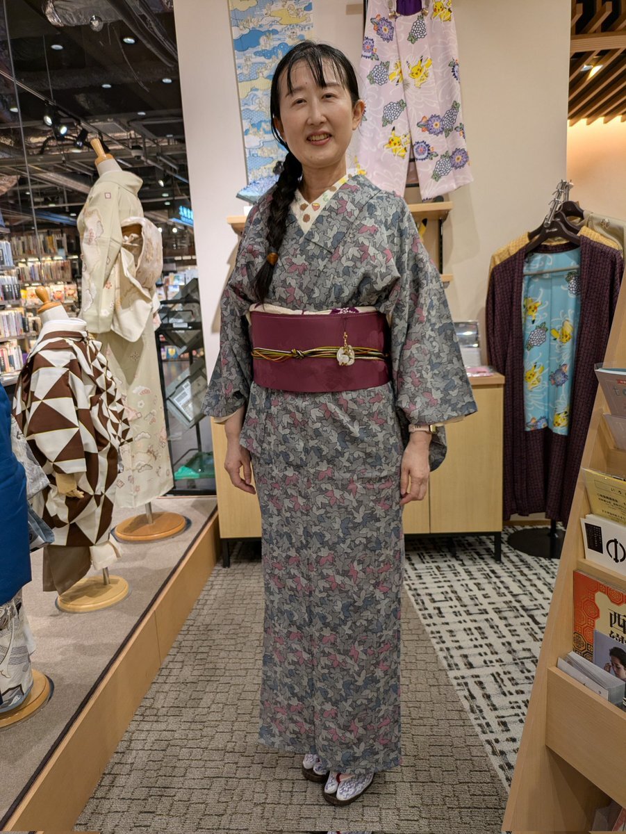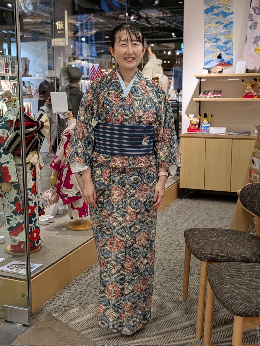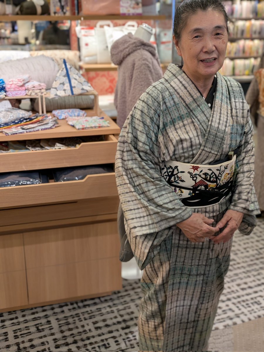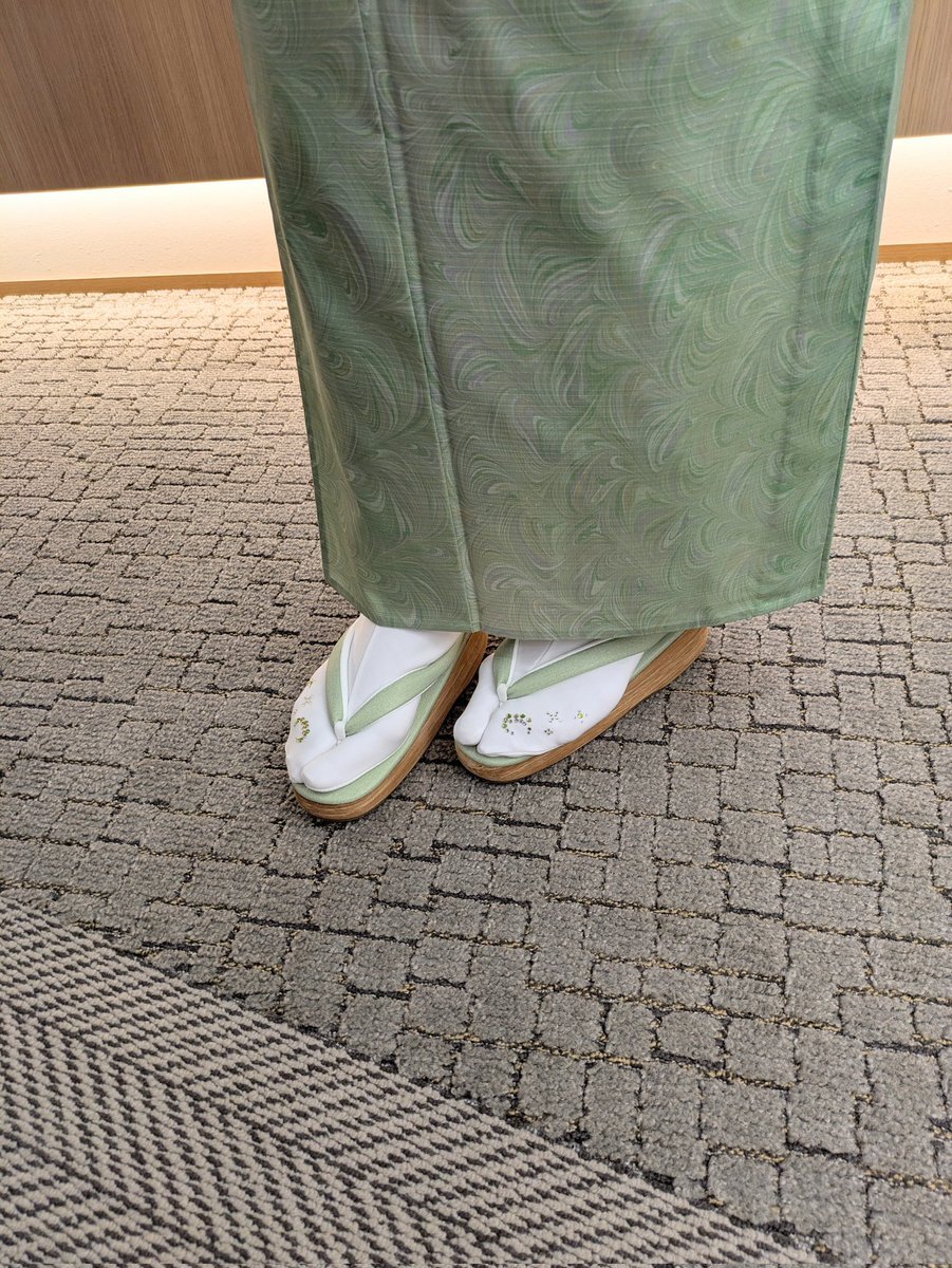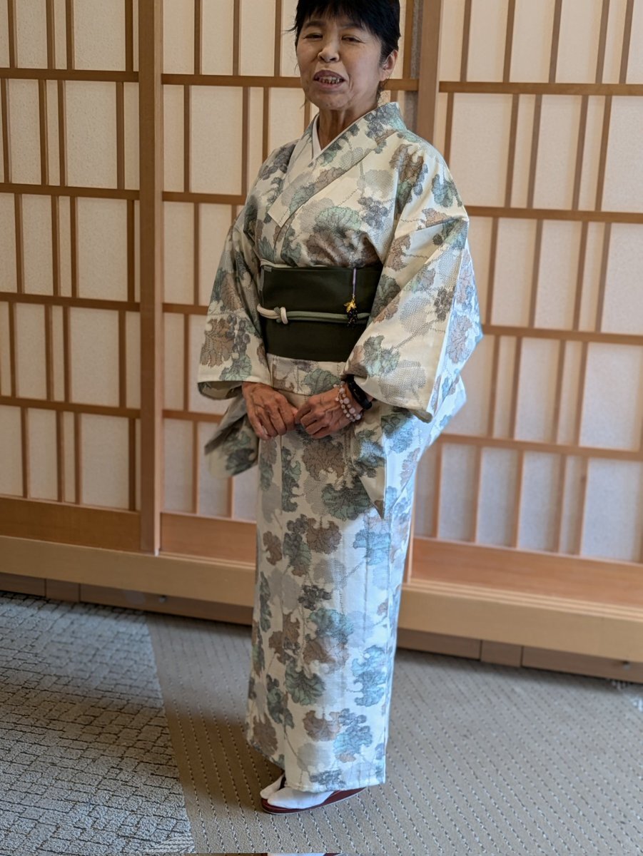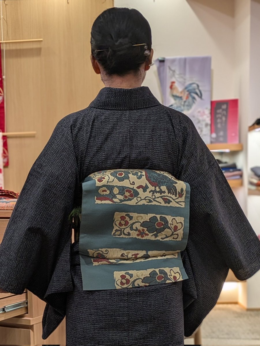 美術館帰りにお立ち寄りくださいました♪ 今日はグリーンコーデ🍋‍🟩 #帯揚げ は、レースをご自分で染められたもの #根付け のとんぼ玉もお手製 #羽織紐 はネックレスをリメイク💎 きもの姿と手作りをたのしんでおられますね☺ 素敵なコーディネートをありがとうございます😊 #着物コーデ #着物生活 pic.x.com/E4Xmd56BoG