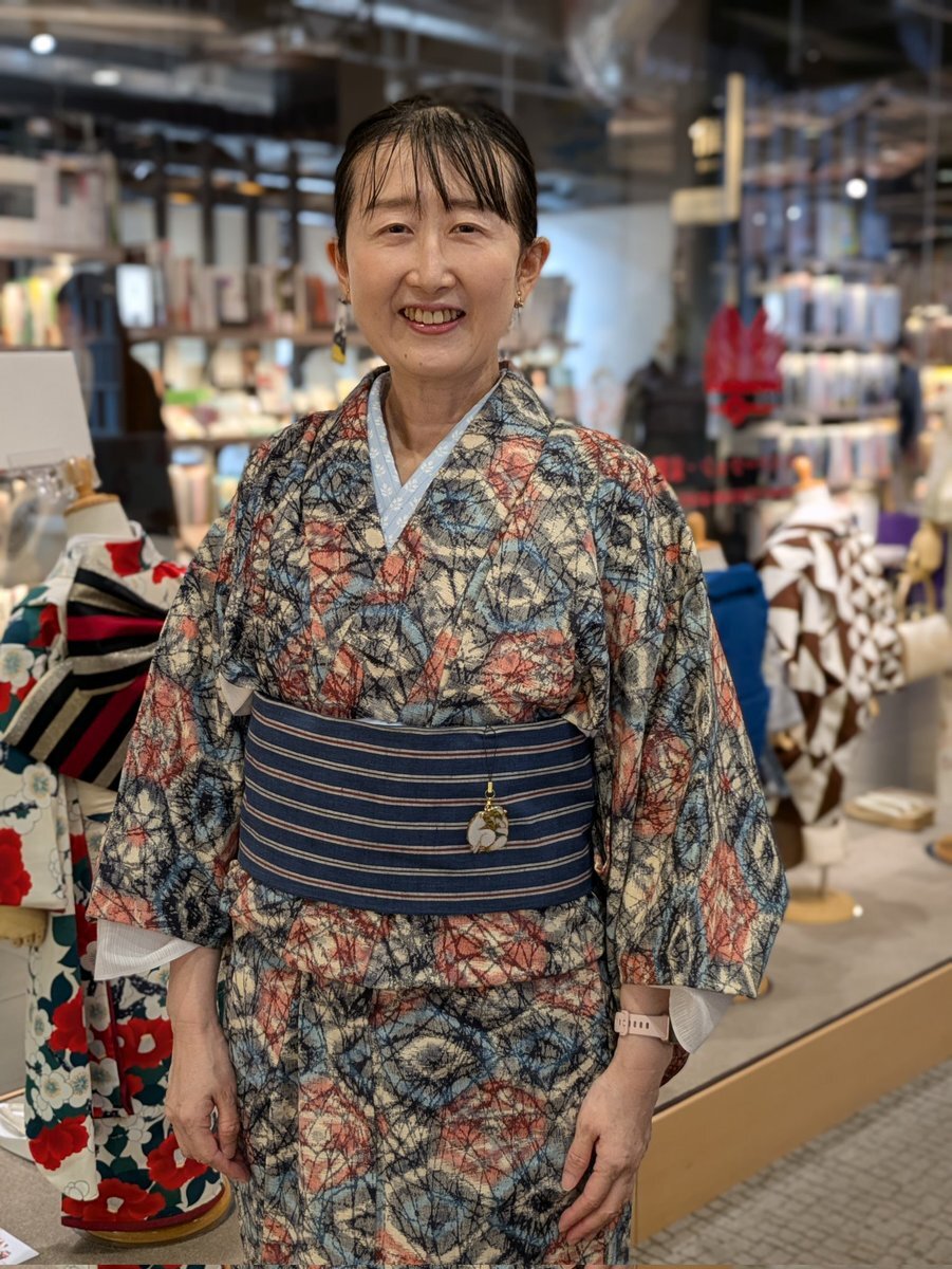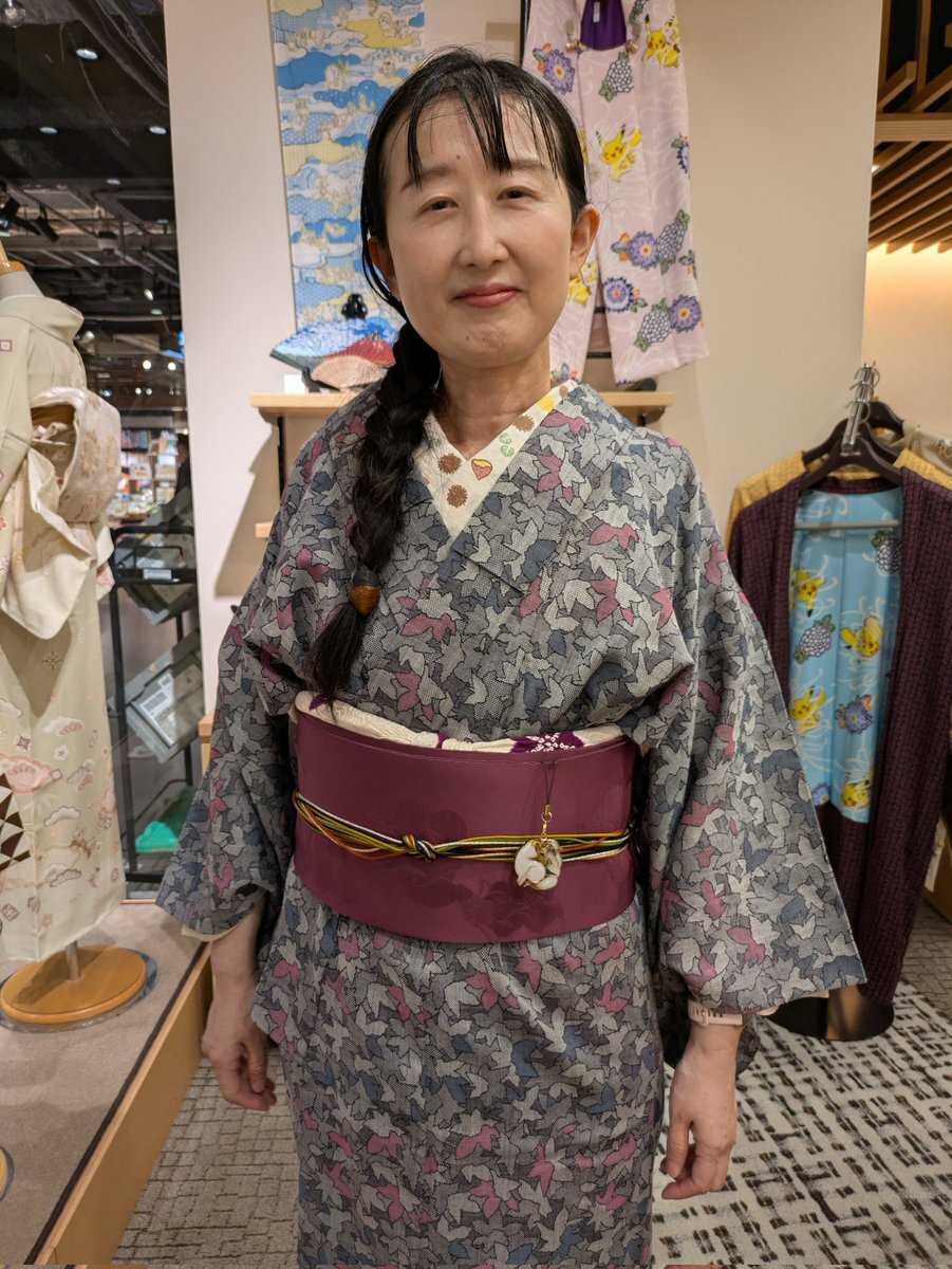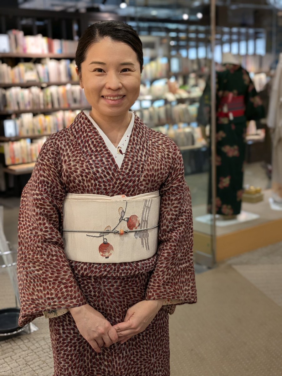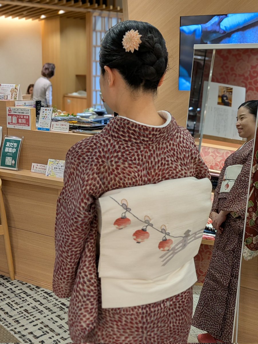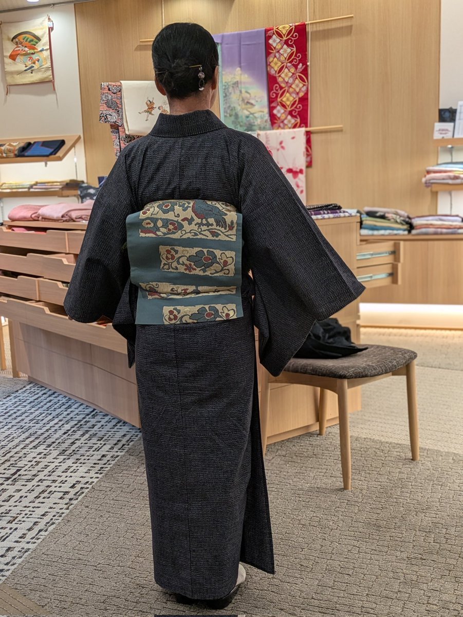 美術館帰りにお立ち寄りくださいました♪ 今日はグリーンコーデ🍋‍🟩 #帯揚げ は、レースをご自分で染められたもの #根付け のとんぼ玉もお手製 #羽織紐 はネックレスをリメイク💎 きもの姿と手作りをたのしんでおられますね☺ 素敵なコーディネートをありがとうございます😊 #着物コーデ #着物生活 pic.x.com/E4Xmd56BoG