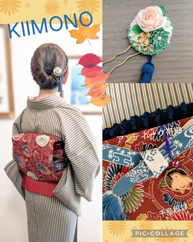 外出先は手芸店🧶🪡    昨日の着物👘 着物コラージュ👘 秋の色 #着物生活  #着物コーデ お品書き 単衣紬、名古屋帯 アンティーク帯締 ツマミブローチ簪(蒼菊) 千鳥根付 pic.x.com/TtFJrzzWep