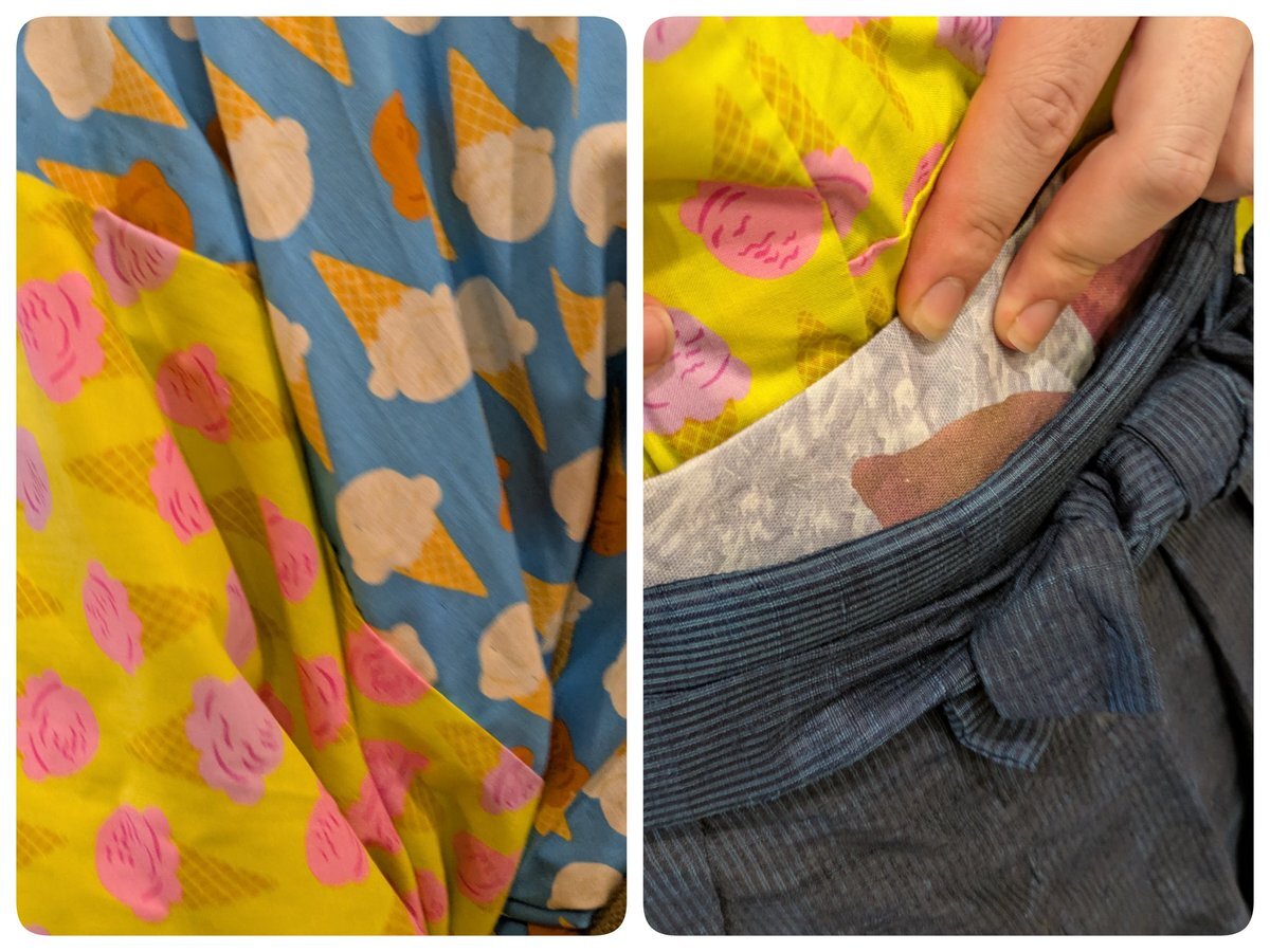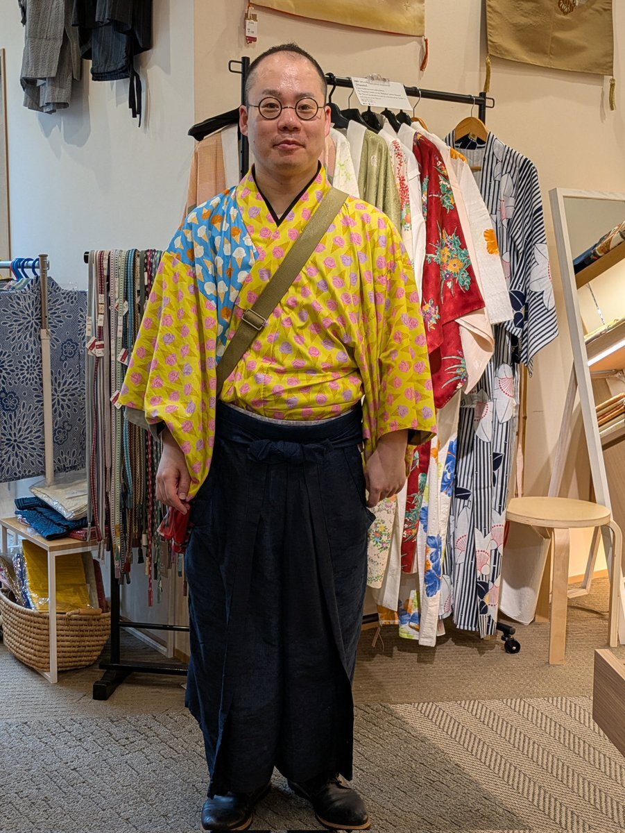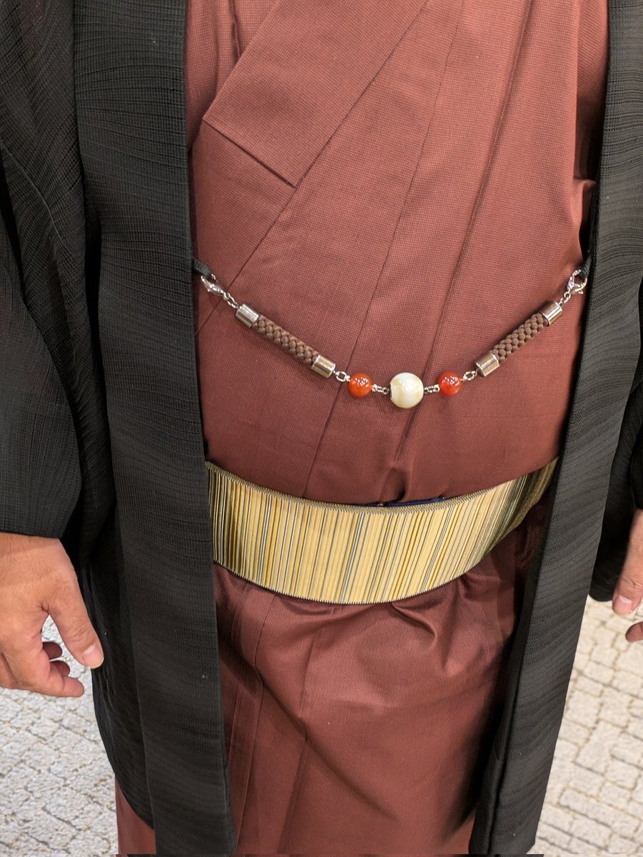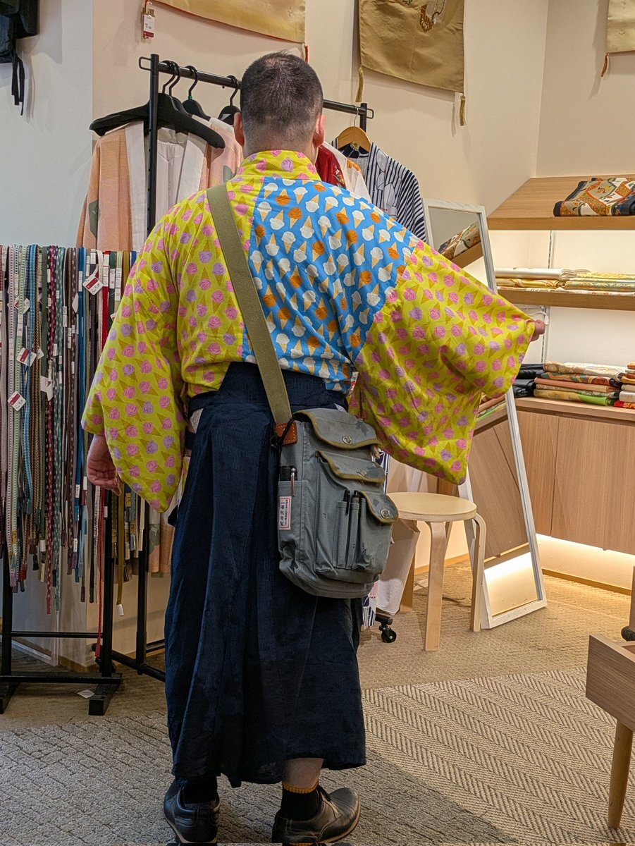#お客様コーディネート👘 雨の日のお洒落なコーディネート☂️のお客さま アイスクリーム柄の #きもの に サツマイモとアルミホイル柄の #角帯 雨なので黒の靴に 黒地の #半衿 木綿の # を歩きやすいようにリメイクされた形がまたカッコいいですね✨ #着物コーデ #着物生活 #着物好き #きもの男子 pic.x.com/Nl6BnAbPUX