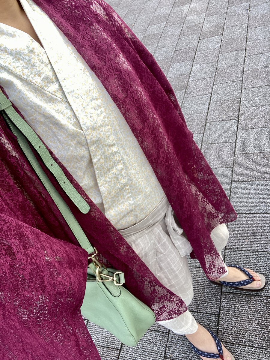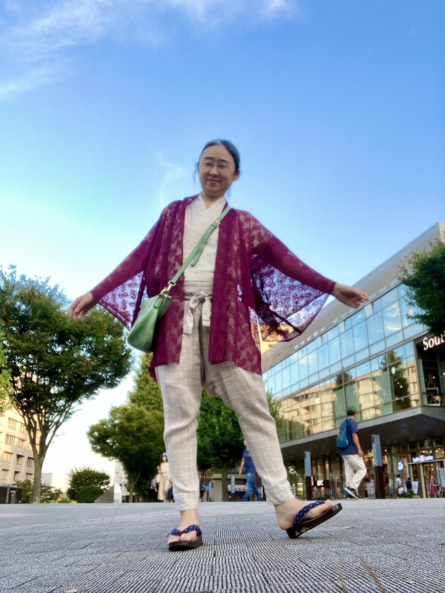 2025/10/02 パスポート受取り、いつも通らない駅前を散策。地元野菜や果物のお店を見つけて、美味しそうな葡萄と空芯菜を買いました。 10月だけど暑いから 麻の #タッツケ袴 半袖 の半着しじら織 生成りコーデに秋色アクセント #広袖#レース羽織 を重ね着で。 #袴生活 #ふだん着物 #着物生活 pic.x.com/dKLNeanqyQ