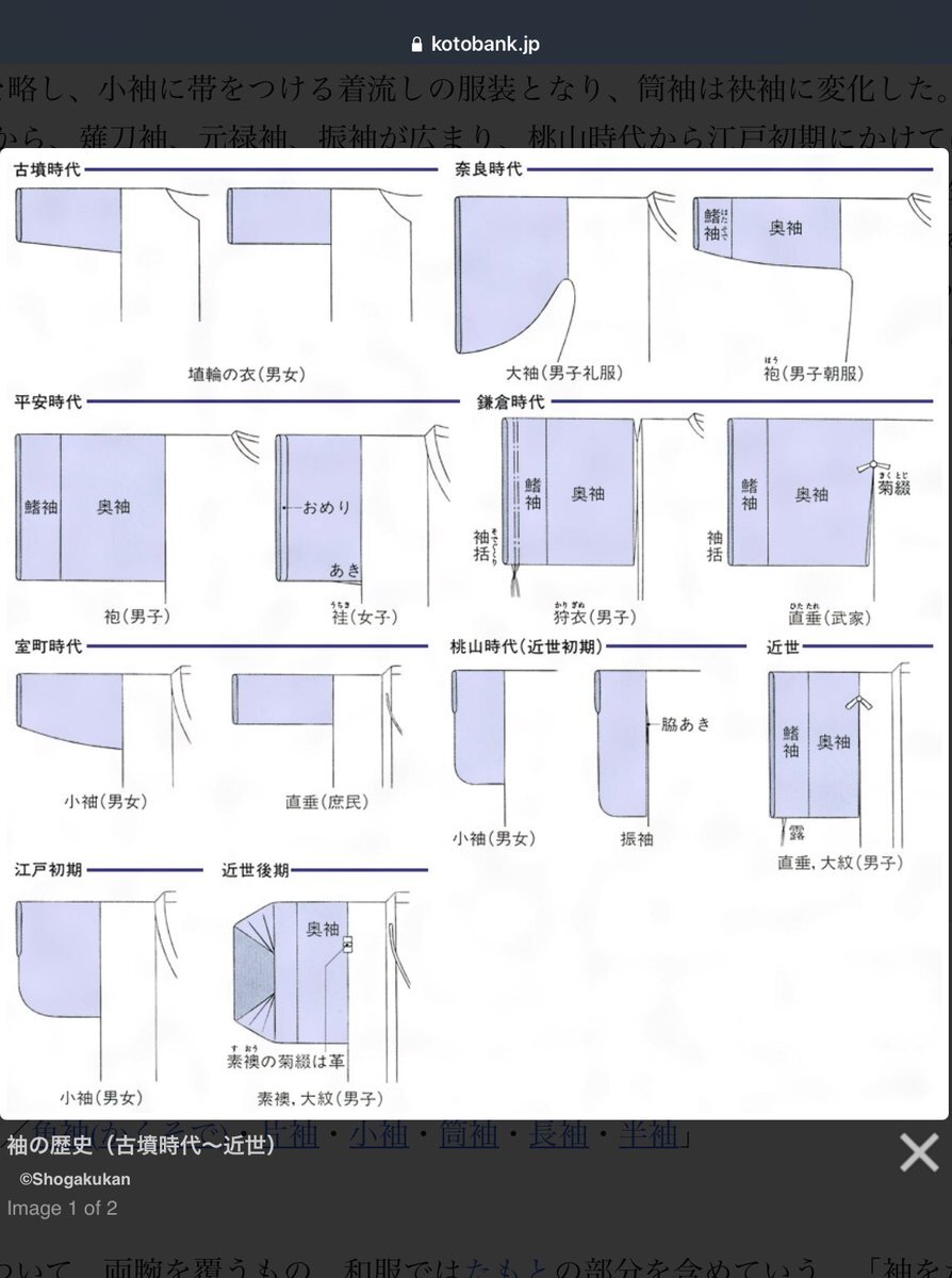 kotobank.jp/word/%E8%A2%96… 写真はサイトより引用 #着物生活 の仕事着は多種多様で実用的。以下の袖を縫い着て生活してます。 図に有…江戸初期小袖、広袖、筒袖、舟底袖/薙刀袖、もじり袖/巻き袖、室町時代直垂/庶民 図に無…琉装の袖、マチ付き袖、西馬音内盆踊りの袖、袖なし #着物は機能的pic.x.com/5yg6IldAKU