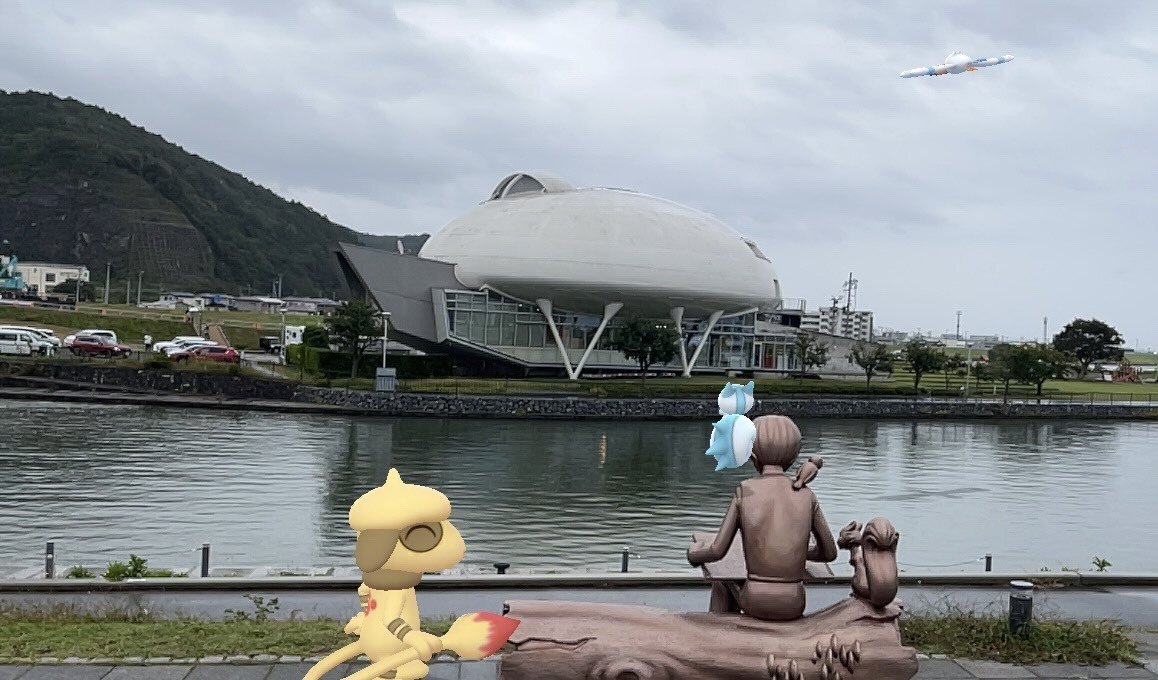 「一緒にえがこう」 #GOsnapshot #ARofTheDay #ARplusT 石ノ森萬画館を臨む 周辺中瀬エリアのポケストップは震災で失われた建物からなる「記憶のポータル」がたくさんありました