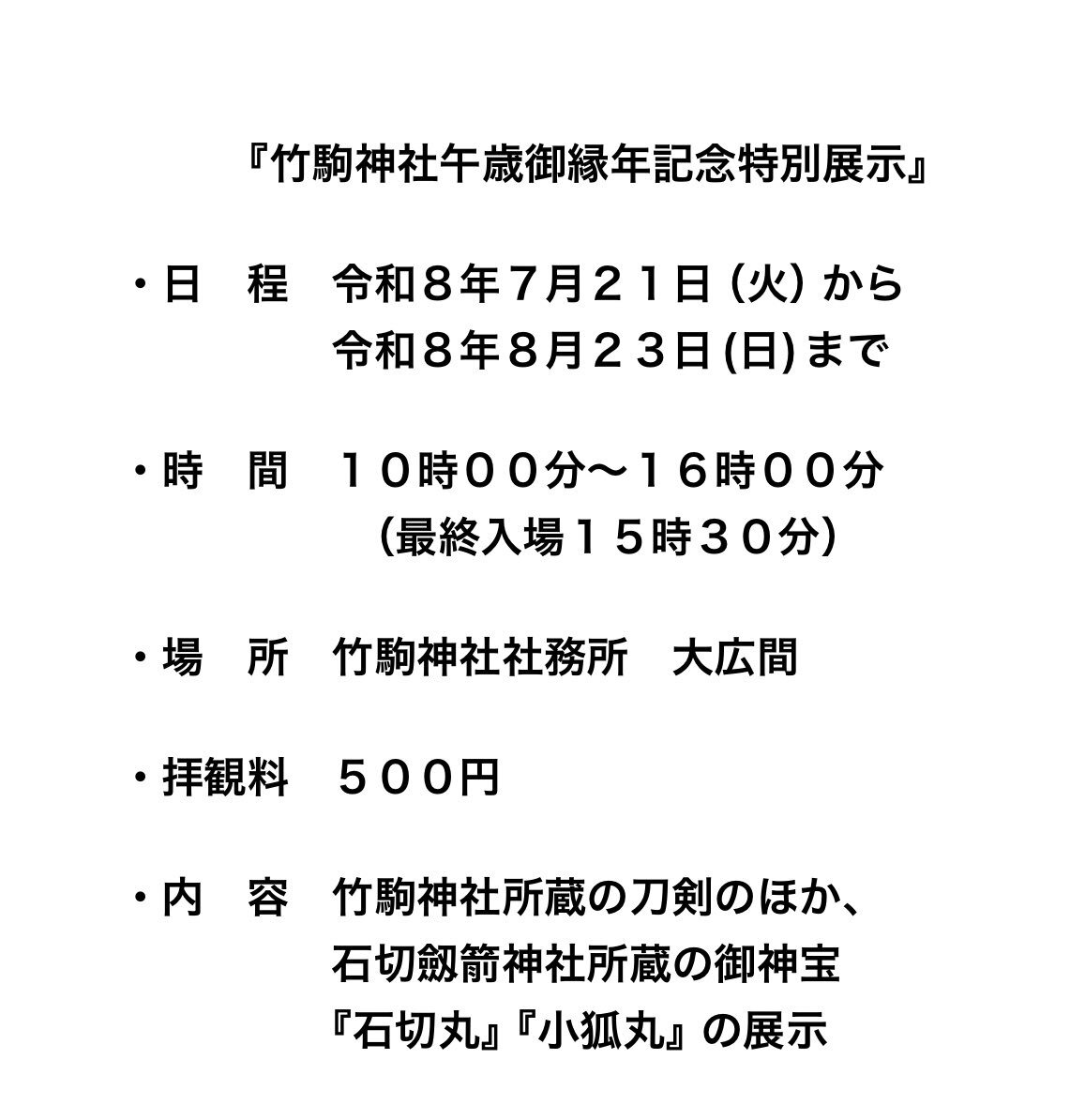 【午歳御縁年記念特別刀剣展について】 令和8年午歳の佳節に刀剣展を行う運びとなりました。 今回も格段のご配慮により、石切劔箭神社様より『太刀 石切丸、太刀 小狐丸』をお借りし、当神社所蔵の刀剣と共に展示をさせていただきます。 どうぞ宜しくお願いいたします🦊 #竹駒神社 #石切丸 #小狐丸 pic.x.com/FFQqtU4wxF