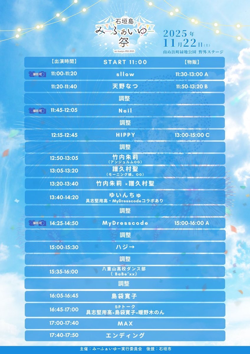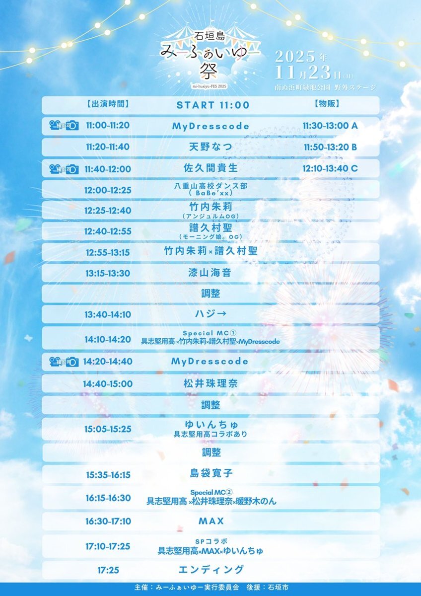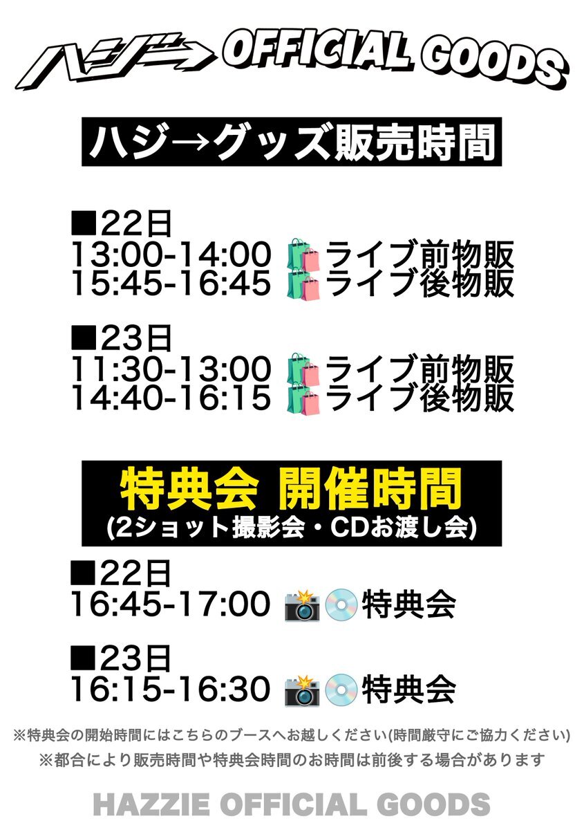 【ハジ→物販&特典会スケジュール】 #みーふぁいゆー祭 ハジ→石垣島初ライブ記念🏝️🎉 豪華特典盛り沢山✨️ ・対象のかたへ2ショット撮影会! ・CDご購入でハジ→が直接CDお渡し会! ・全てのグッズが直筆サイン特典付! 実施時間は画像をcheck☑ ぜひ物販ブースへお立ち寄り下さい♬