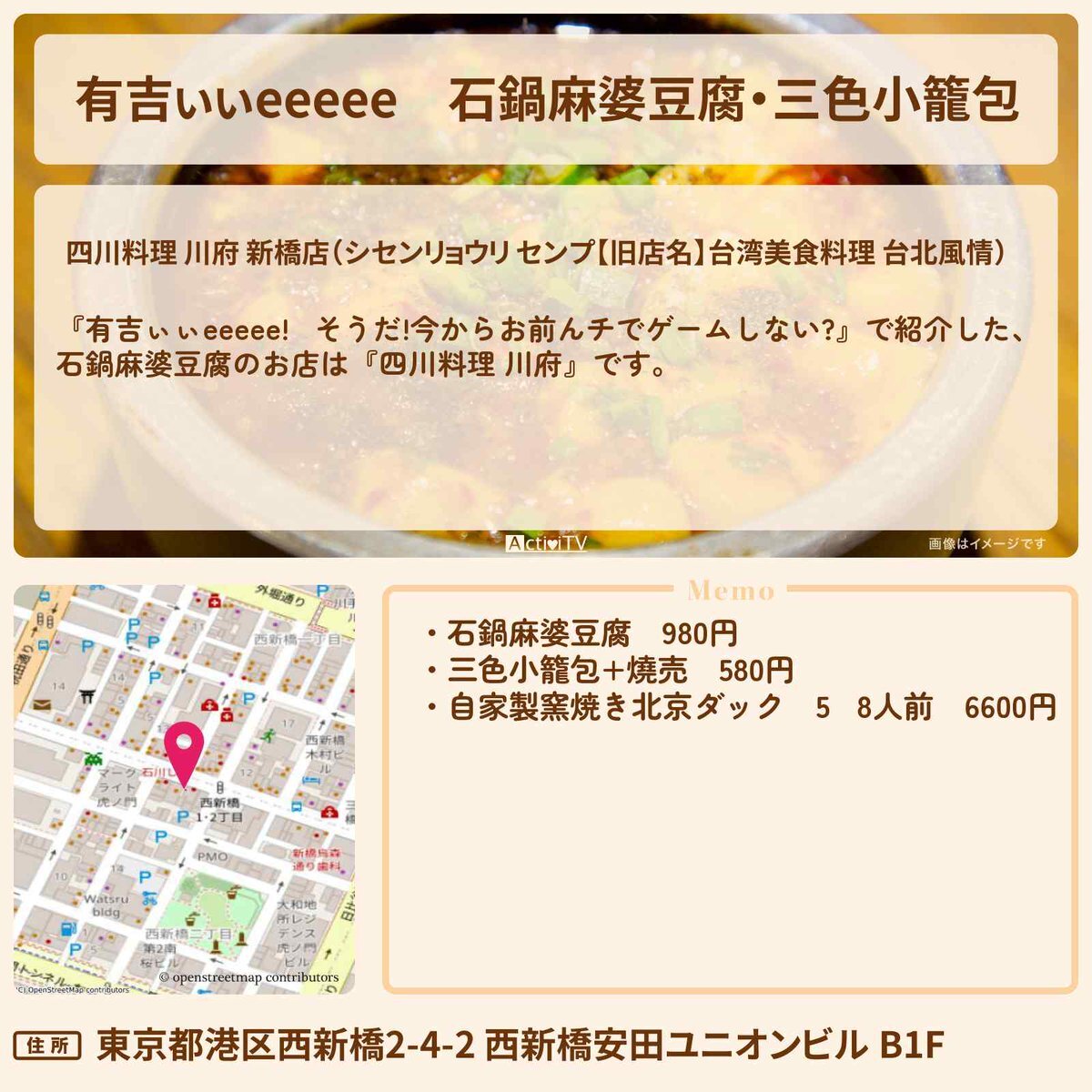 #有吉ぃぃeeeee 新橋 石鍋麻婆豆腐・三色小籠包 #丹生明里 #オダウエダ がゲストでロケ 『四川料理 川府』の情報を紹介 【住所】 東京都港区西新橋2-4-2 B1F 詳しくは👉 activitv.com/entry/ariyoshi… #有吉弘行 #トシ #田中卓志 #アンガールズ #石田ニコル pic.x.com/DVOkokAVFm
