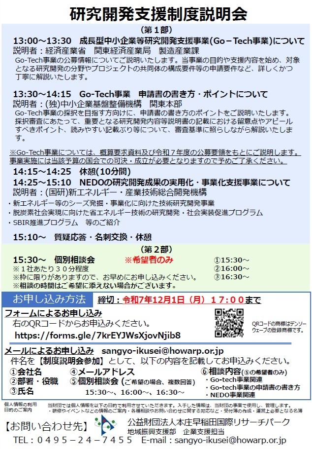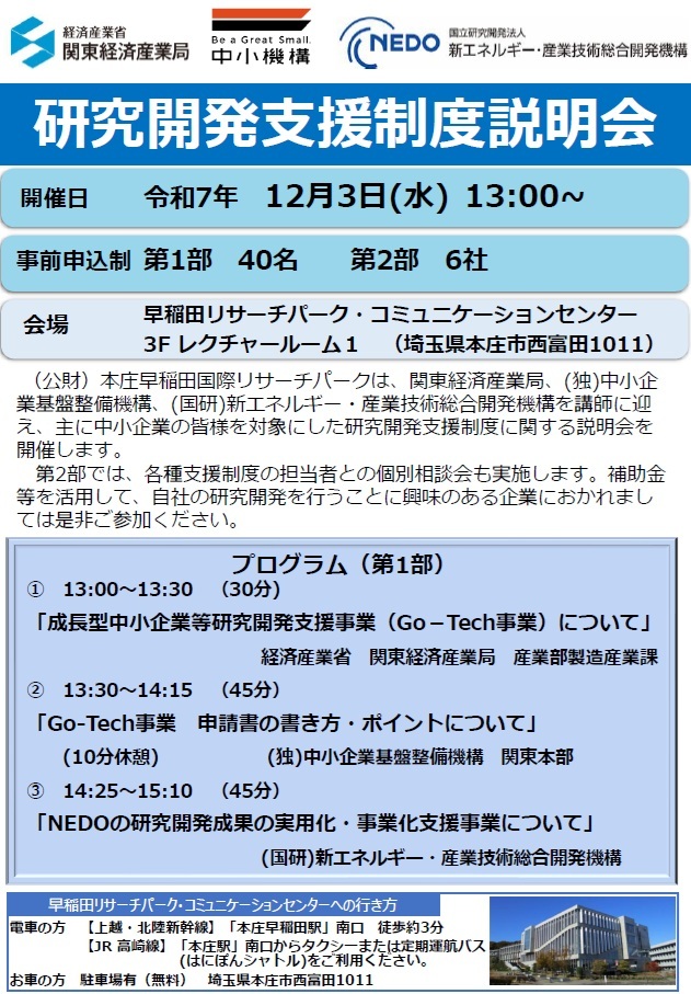 12/3(水)中小企業・大学・研究機関のための「研究開発支援制度説明会」(参加費無料)を開催します。補助金等を活用した研究開発に関心のある企業は、ぜひご参加ください。詳細はこちら→ howarp.or.jp/eventnews/r7se… #補助金活用 #補助金 #研究開発支援 #研究開発 #本庄早稲田 pic.x.com/iibbbQguZ7