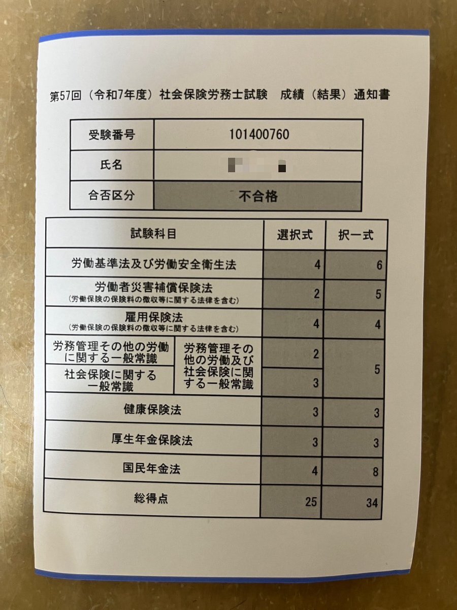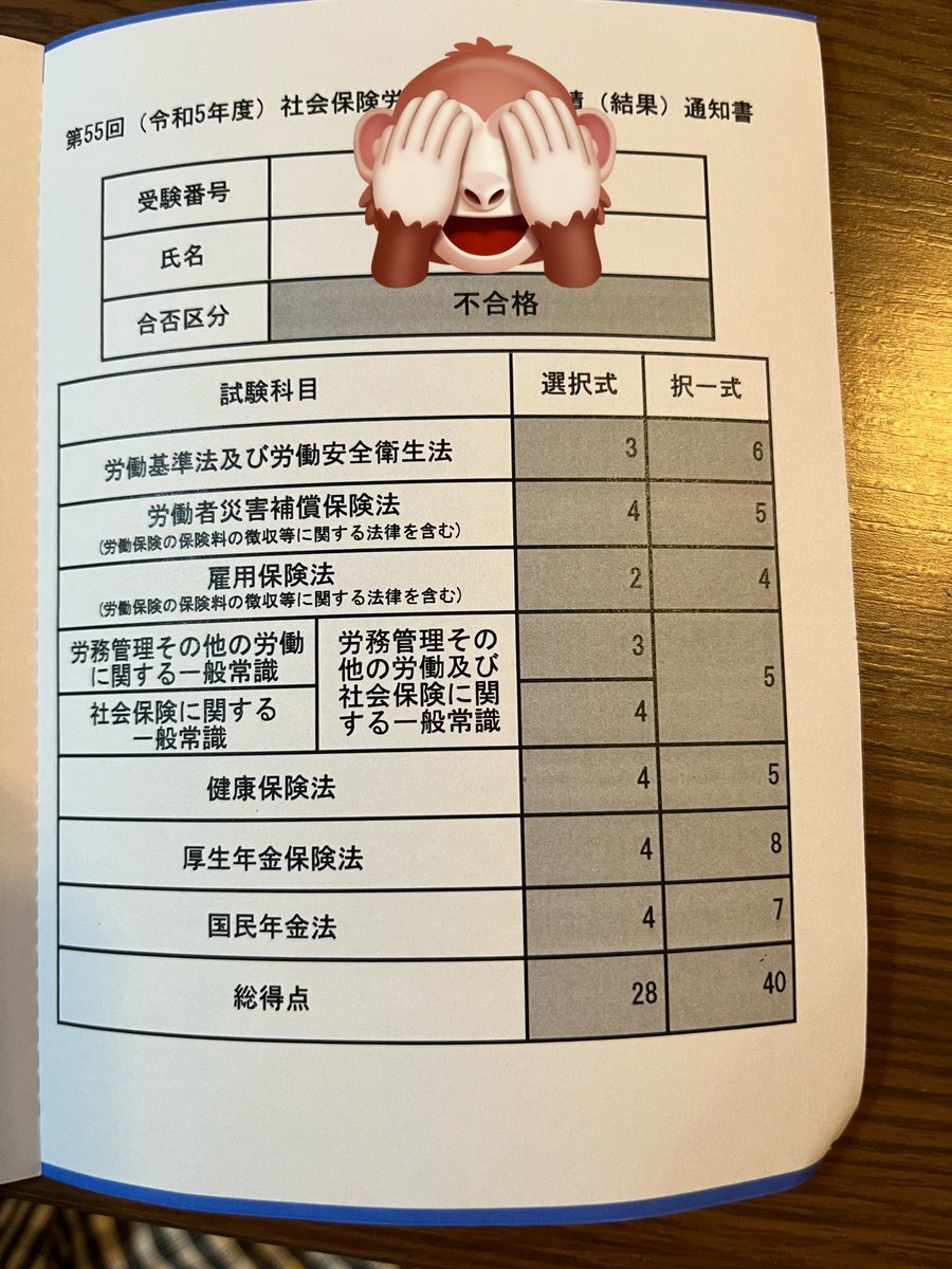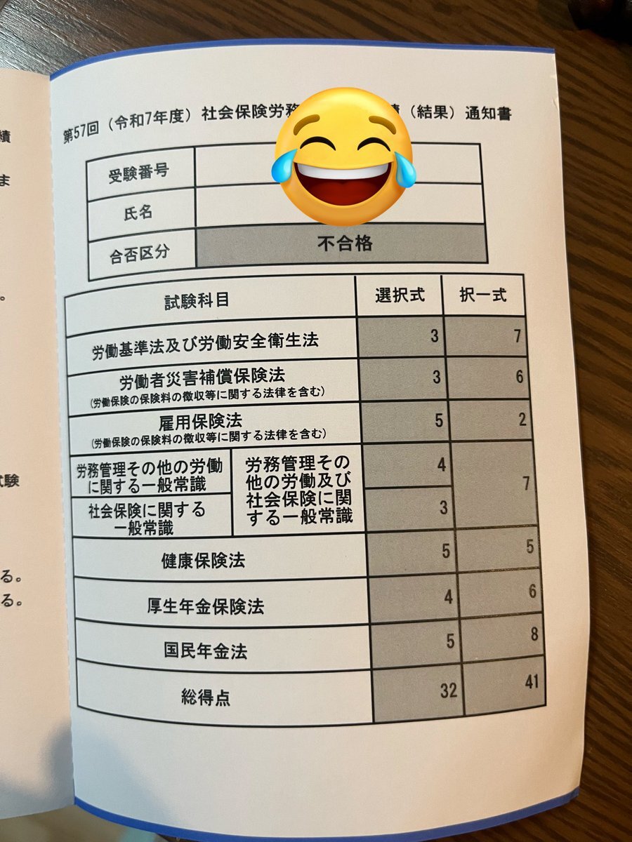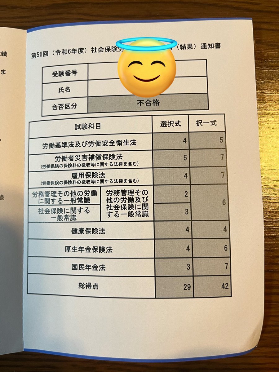 昨日、社会保険労務士試験の結果が届きました。 選択は基準点の下方修正が3科目あり、科目別基準点と総得点は合格基準をクリア 択一も基準点の下方修正が1科目あり、総得点も昨年よりも下がりましたが、総得点で全く及びませんでした。 来年に向けて、また頑張ります #社労士受験 #社労士受験生 pic.x.com/OCBZbXsaF0