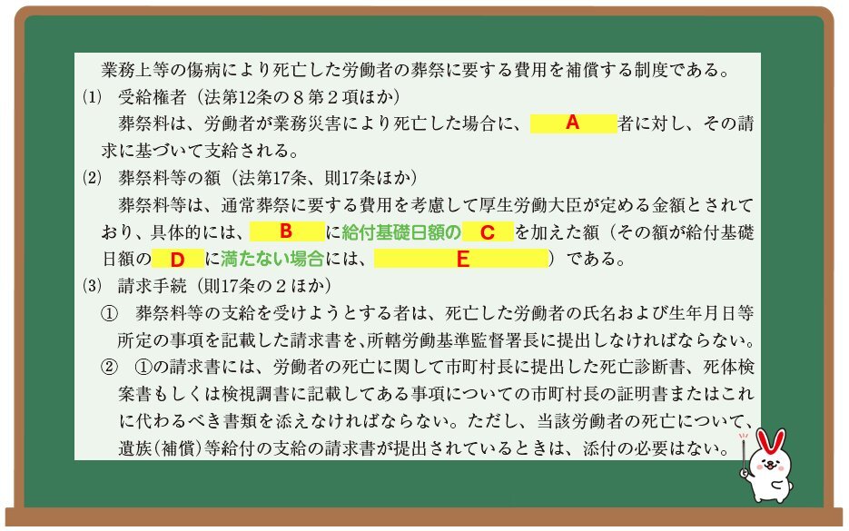 【Xで復習✍️】 葬祭料等(葬祭給付)に関する次の空欄に入る言葉は? (「社労士V」2025年10月号P40) #社労士受験 #シャロ勉 #社労士V 答え A 葬祭を行う B 315,000円 C 30日分 D 60日分 E 給付基礎日額の60日分 pic.x.com/wbqLs7P2ih