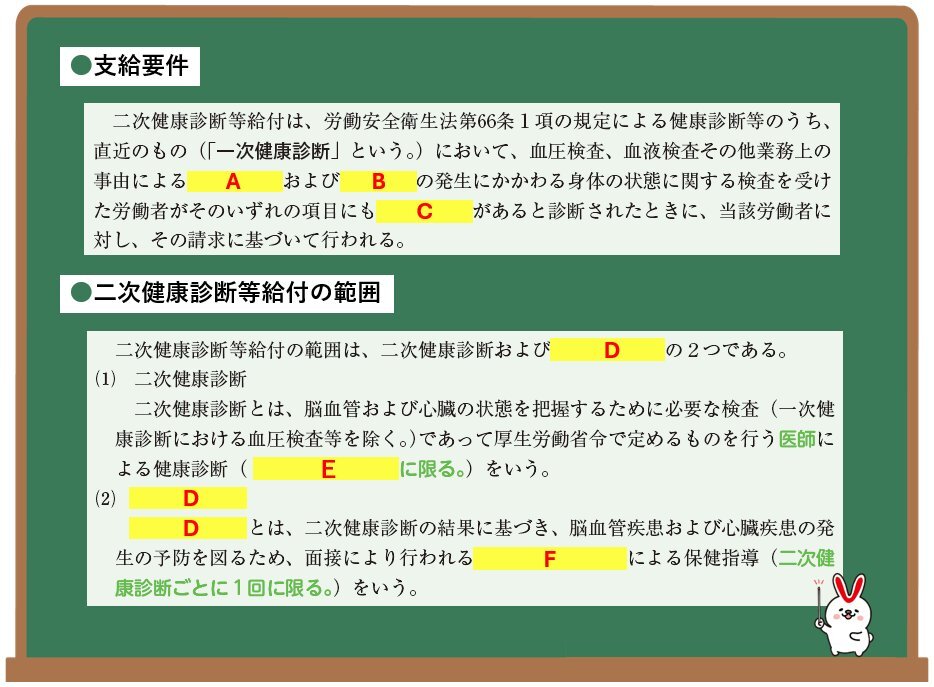 【Xで復習✍️】 二次健康診断等給付に関する次の空欄に入る言葉は? (「社労士V」2025年10月号P41) #社労士受験 #シャロ勉 #社労士V 答え A 脳血管疾患 B 心臓疾患 C 異常の所見 D 特定保健指導 E 1年度につき1回 F 医師または保健師 pic.x.com/g8eoZ6C84x