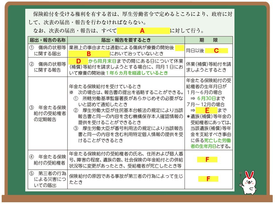 【Xで復習✍️】 保険給付に関する届出・報告に関する次の空欄に入る言葉は? (「社労士V」2025年10月号P45) #社労士受験 #シャロ勉 #社労士V 答え A 所轄労働基準監督署長 B 1年6カ月を経過した日 C 1カ月以内 D 1月1日 E 10月31日 F 遅滞なく pic.x.com/A2FVsI6f4n