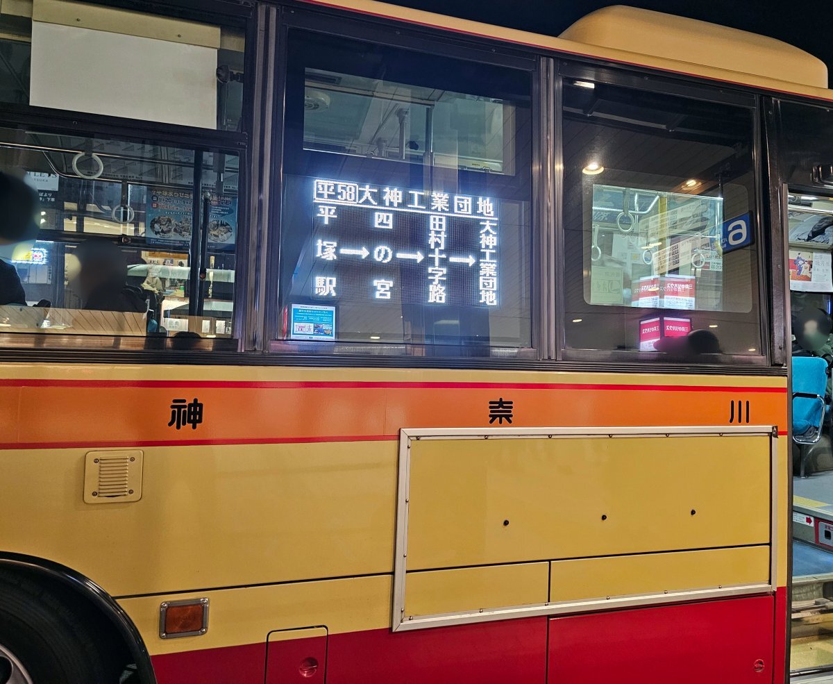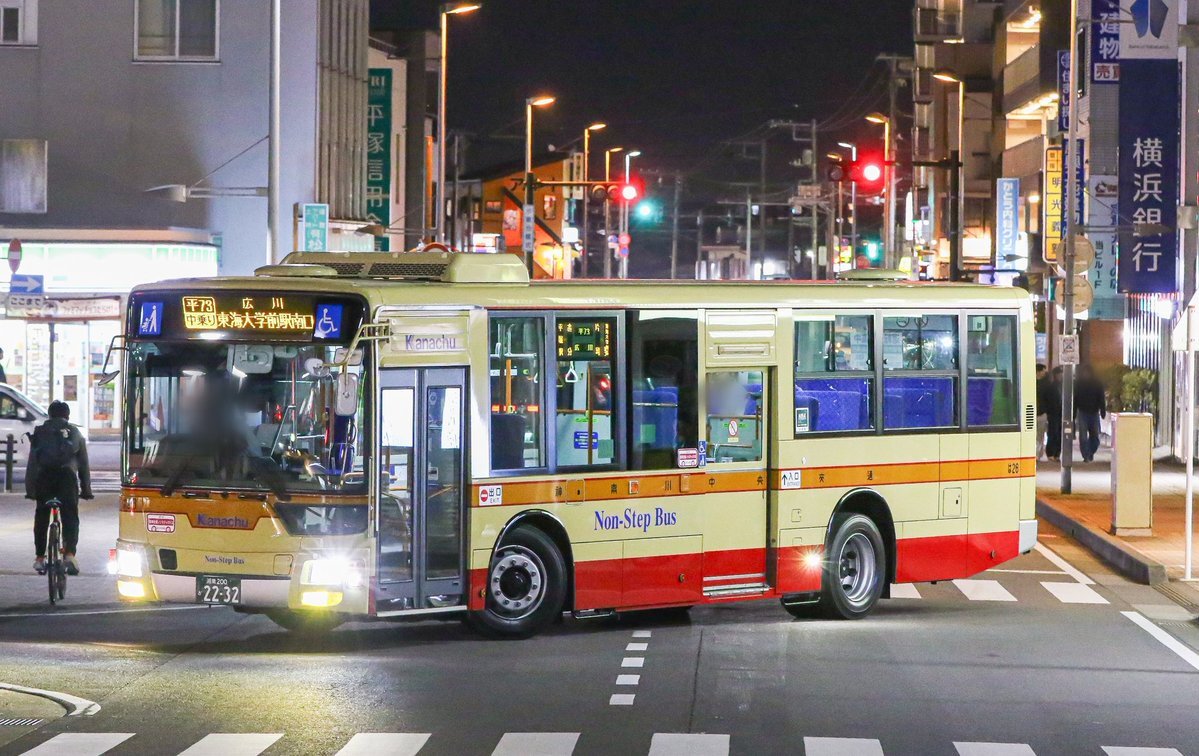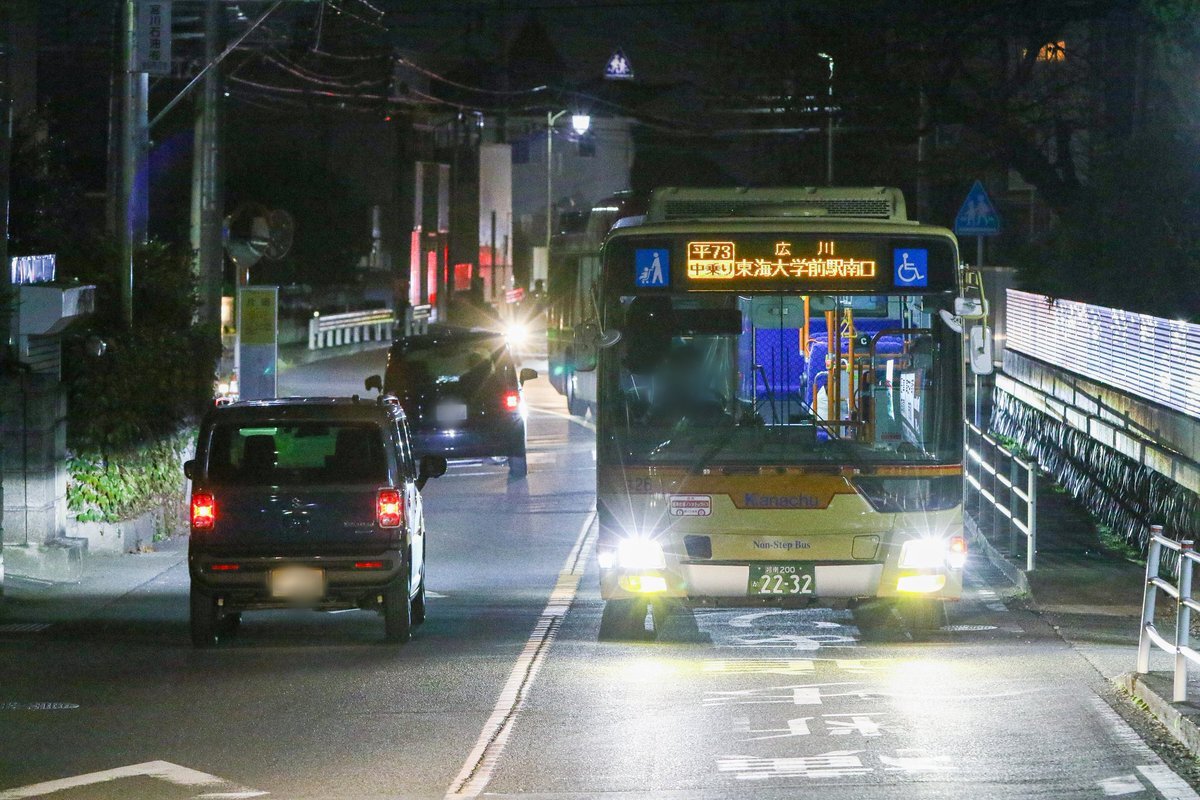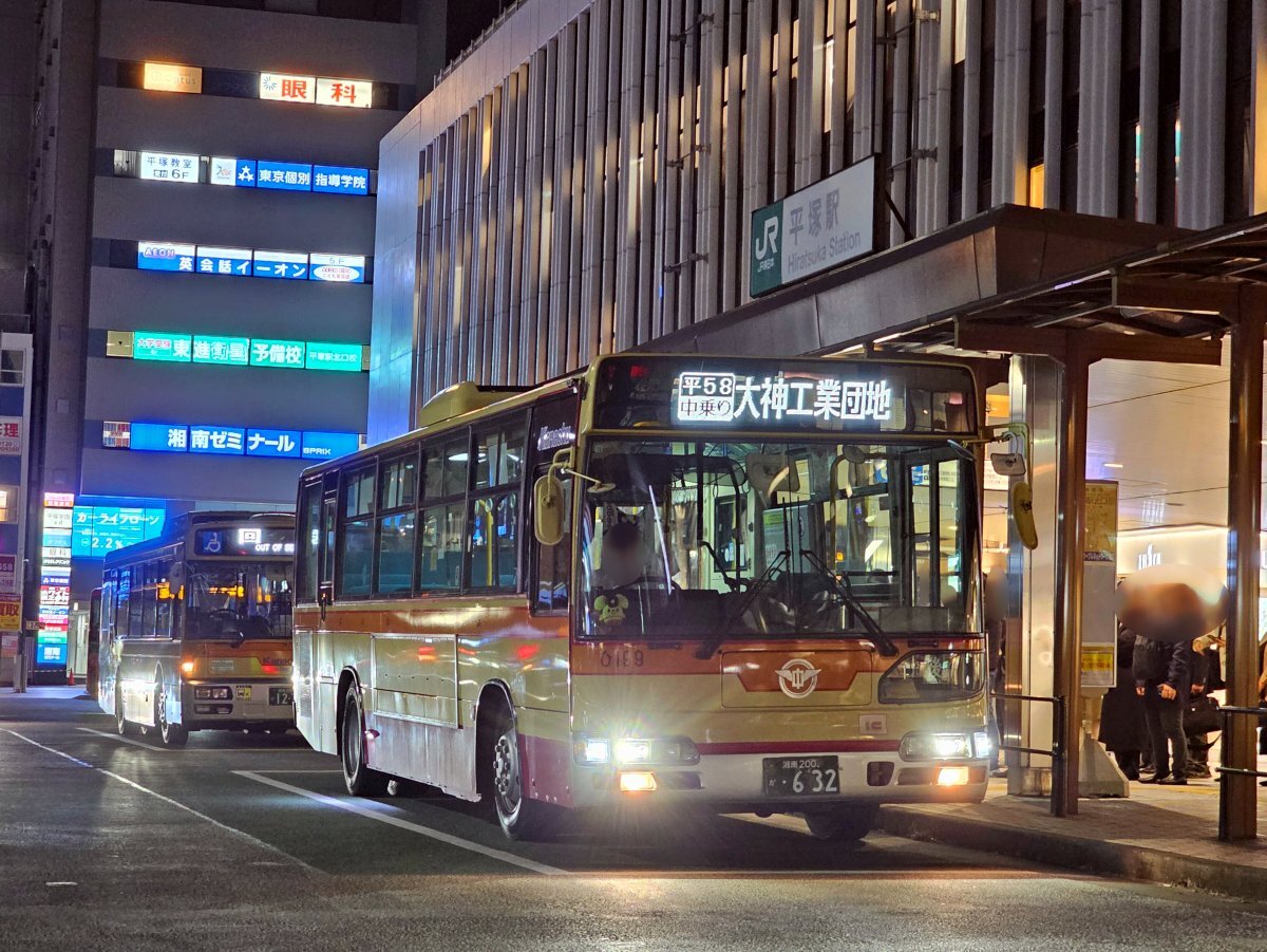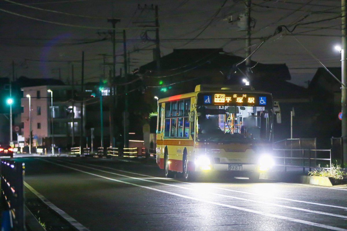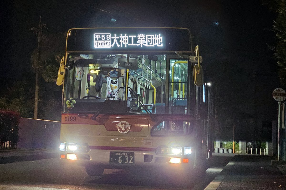 本日、社紋付ブルーリボンシティの「ひ199」が、1日1.5往復のみ運行されている 平58 平塚駅北口~大神工業団地線(平塚駅北口20:20発)に入りました。 BRCの平58での運用は何度かありますが、ダルマポールが残る大神工業団地のバス停の夜景なども、貴重なシーンになるかと思います。 #神奈中 #BRC pic.x.com/xe08HddldO