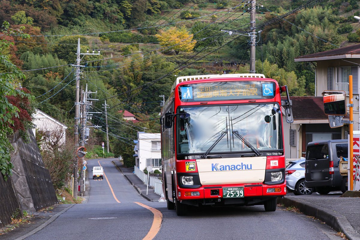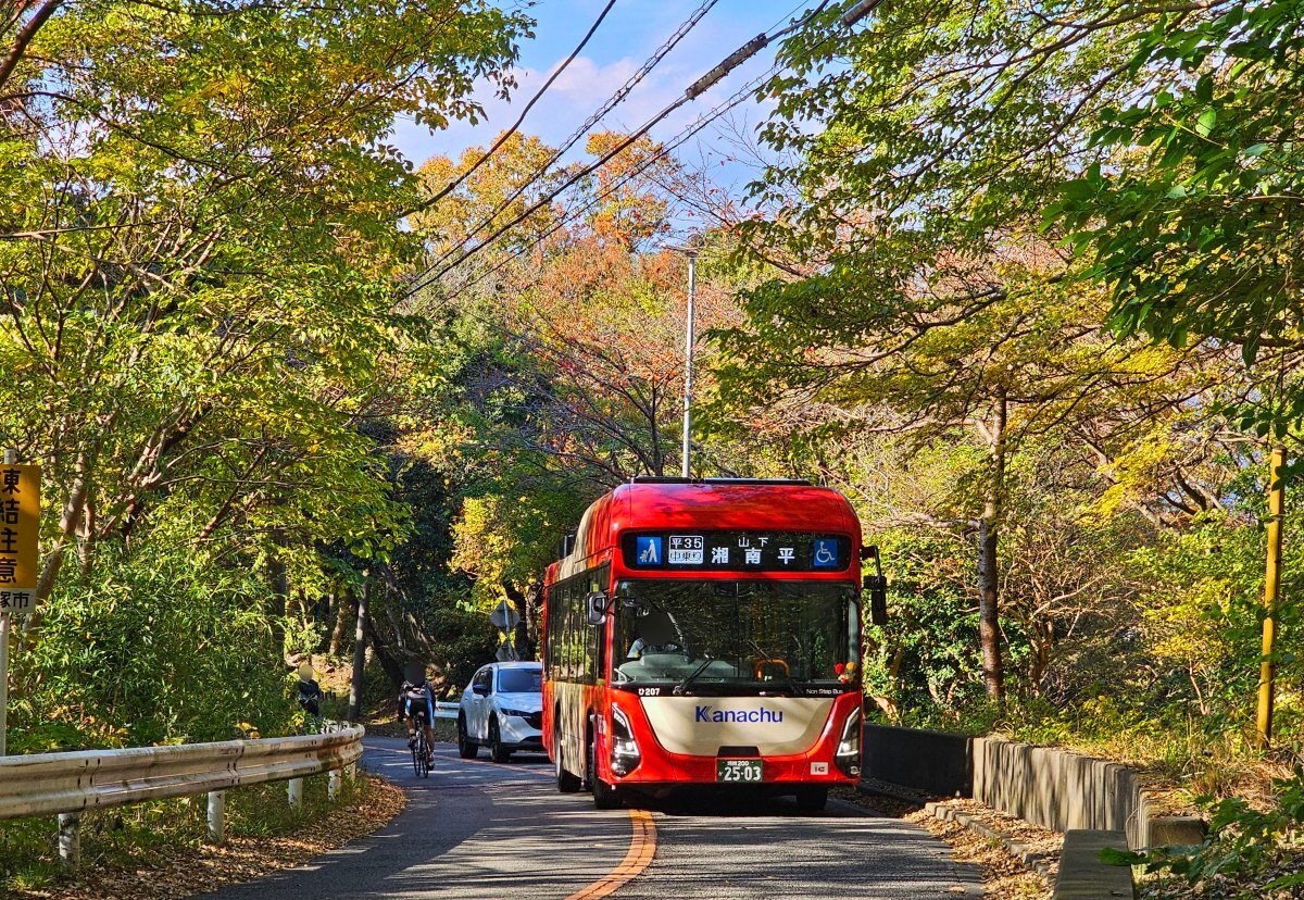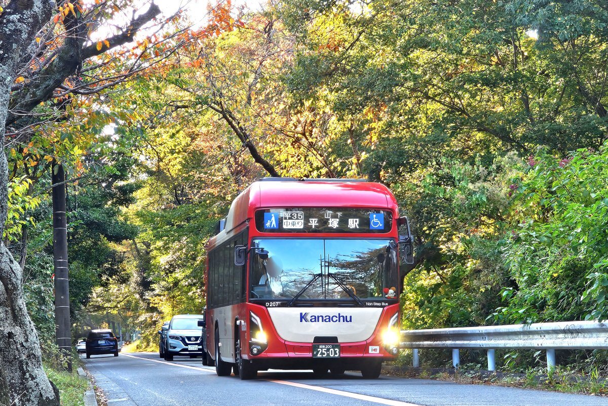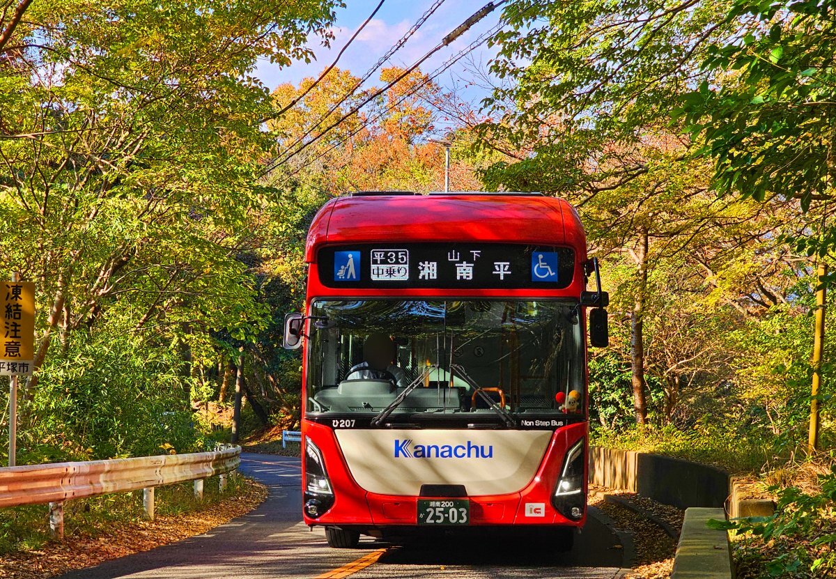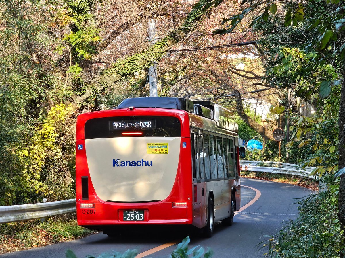 本日、神奈中平塚営業所の「ひ207 (エルガEV)」が、「平35 平塚駅北口~湘南平線 (平塚駅北口13:13発、湘南平13:55発) 」で運用されました。 天気の良い土曜日、紅葉も見頃ということで交通量は多めでしたが、被られることなく、紅葉をバックに走るエルガEVを撮影することができました。 #神奈中 pic.x.com/2tesVYvsvx