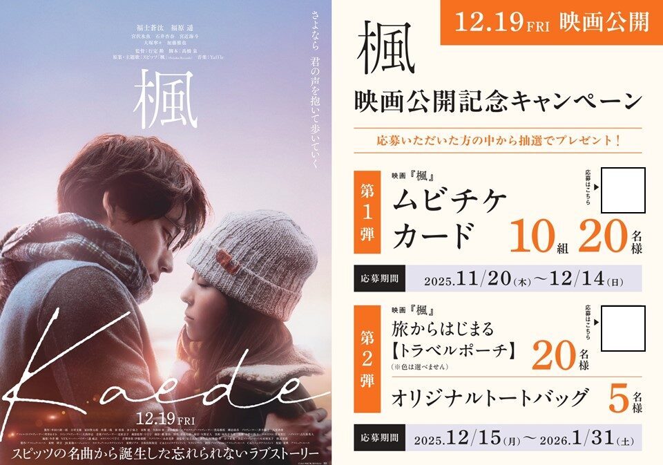 名曲「楓」から誕生した忘れられないラブストーリー🍁 12月19日(金) 公開『楓』SNSプレゼントキャンペーン 抽選でオリジナルグッズをプレゼント🎁 🔸応募方法🔸 ➀このアカウントをフォロー ➁【#109シネマズで楓】を付けて この投稿を引用リポスト🔃 期待・感想もお待ちしています💬