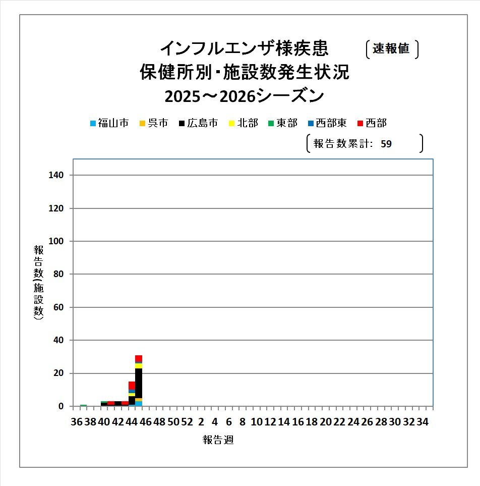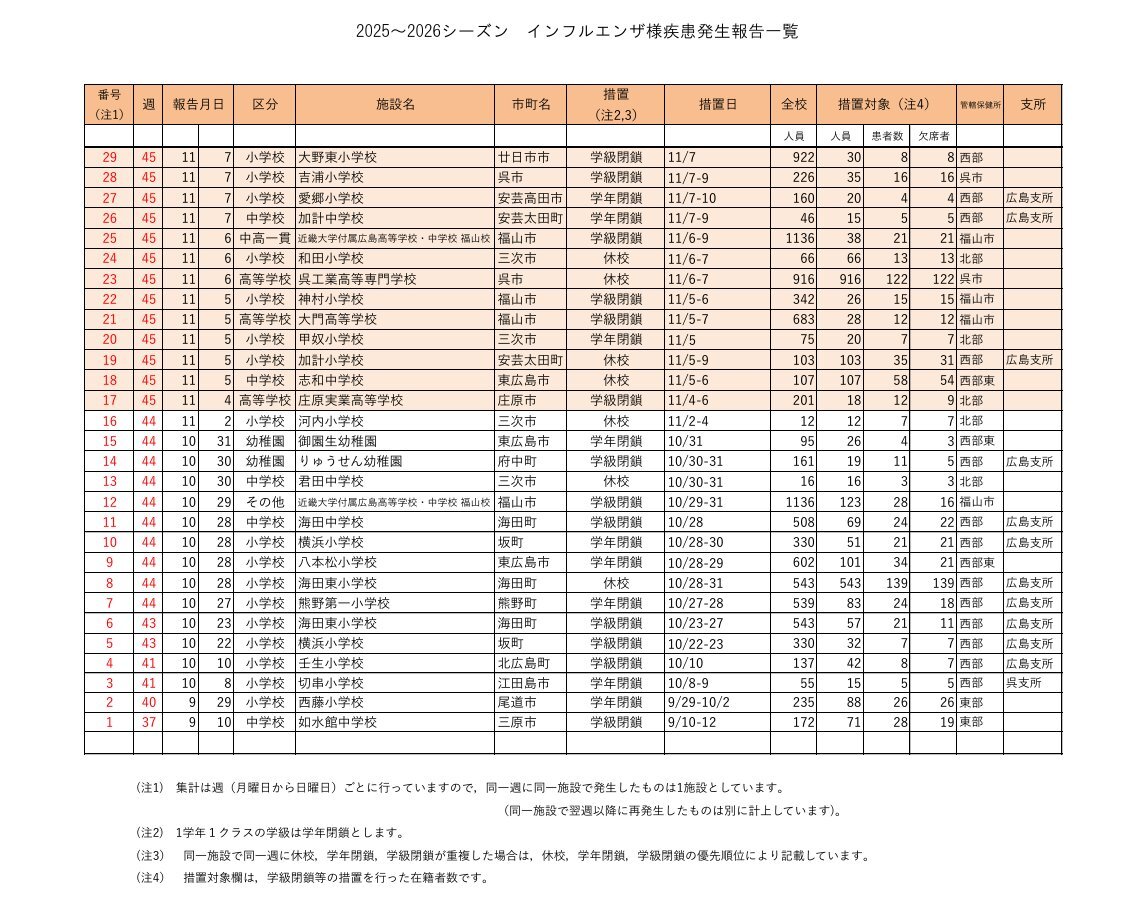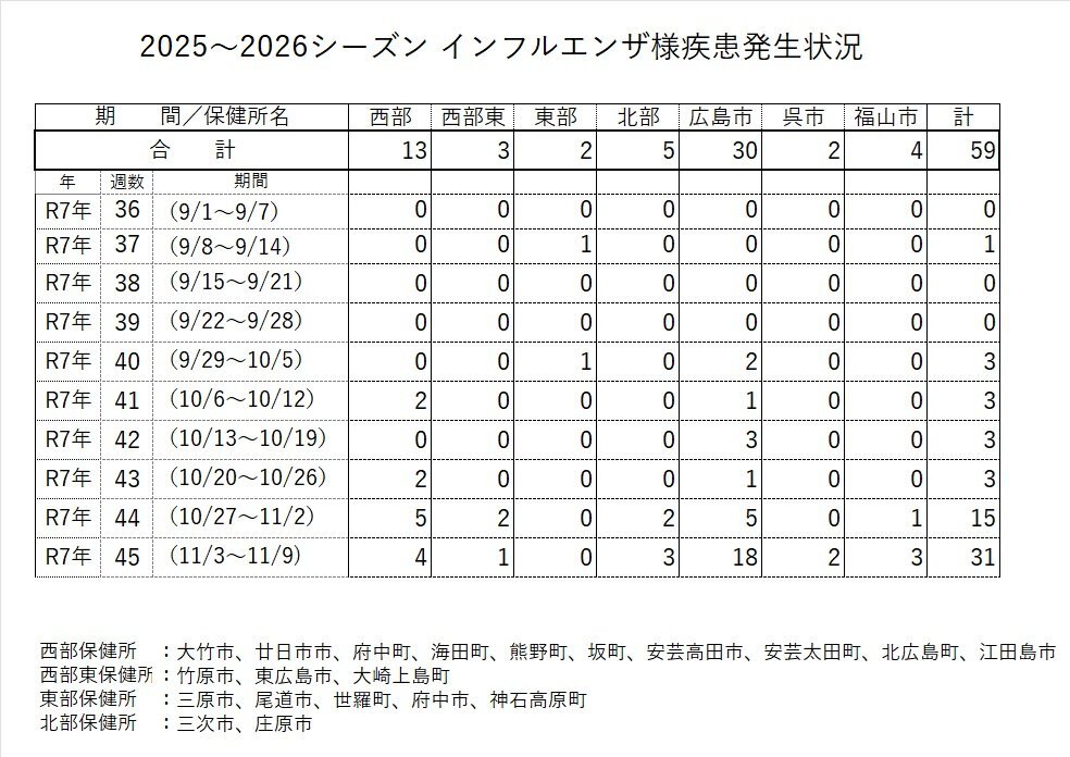 11月12日 インフルエンザ様疾患による学級閉鎖などの措置状況 保健所別発生状況<令和7年11月9日現在報告のあったもの(速報値)> 第45週(11/3~11/9) 計31 西部 4 西部東 1 東部 0 北部 3 #広島市 18 #呉市 2 #福山市 3 2025~26シーズン 累計 59 pref.hiroshima.lg.jp/site/hcdc/infu… x.com/ygd862/status/… pic.x.com/VUmW4lASyK