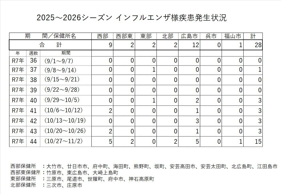 11月5日 インフルエンザ様疾患による学級閉鎖などの措置状況 保健所別発生状況<令和7年11月2日現在報告のあったもの(速報値)> 第44週(10/27~11/2) 計15 西部 5 西部東 2 東部 0 北部 2 #広島市 5 #呉市 0 #福山市 1 2025~26シーズン 累計 28 pref.hiroshima.lg.jp/site/hcdc/infu… x.com/ygd862/status/…