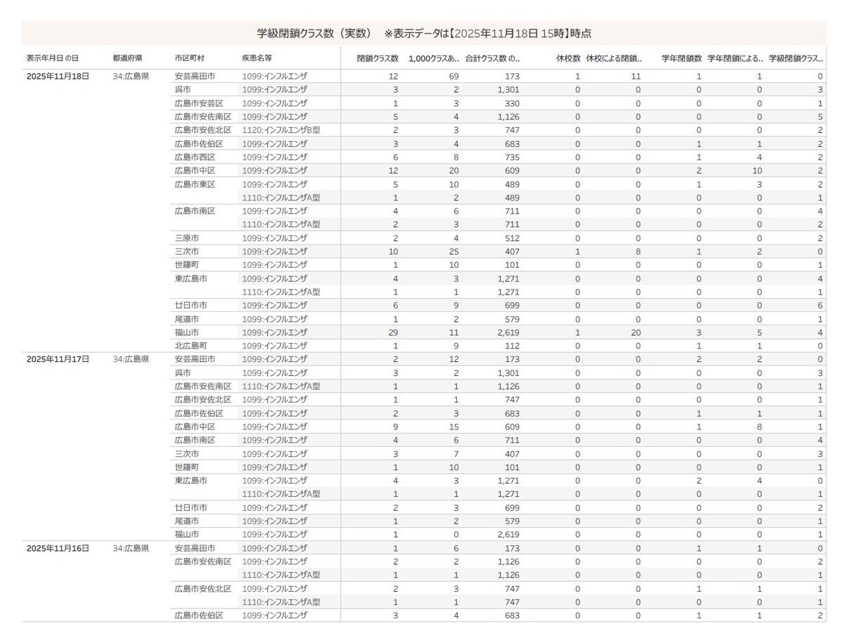 日本学校保健会 学級閉鎖情報 11月18日15時時点 インフルエンザ #安芸高田市 12 (休校数1・休校による閉鎖クラス数11・学年閉鎖数1) #呉市 3 (休校数0・学年閉鎖数0) #広島市 安佐南区 5 (休校数0・学年閉鎖数0) 安芸区 1 (休校数0・学年閉鎖数0) 続く) public.tableau.com/shared/HJWNJ5D…