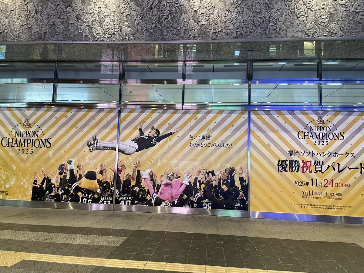 博多駅前なまら綺麗です😭 こんなの見てかつホークス大好きだからもう福岡けらしから離れたくない😱 あと優勝パレードの看板も撮ってきた👍 #博多駅 #sbhawks #福岡ソフトバンクホークス #ホークス優勝パレード pic.x.com/nq7BvhfkVq