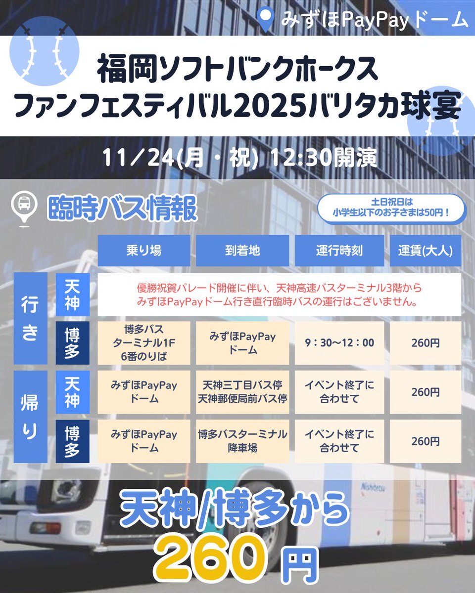 / ファンフェスティバル2025バリタカ球宴 直通臨時バス情報✨ \ #福岡ソフトバンクホークス の イベントに合わせて、 直通臨時バスを運行します!🚌 ぜひ臨時バスを活用して、 イベントをもっと楽しんでください⚾️ ⬇️詳細はこちら nnr.co.jp/bus/rinjibus/d… (⚠️天神→ドームの運行はございません) pic.x.com/OIQ1mIDF8s