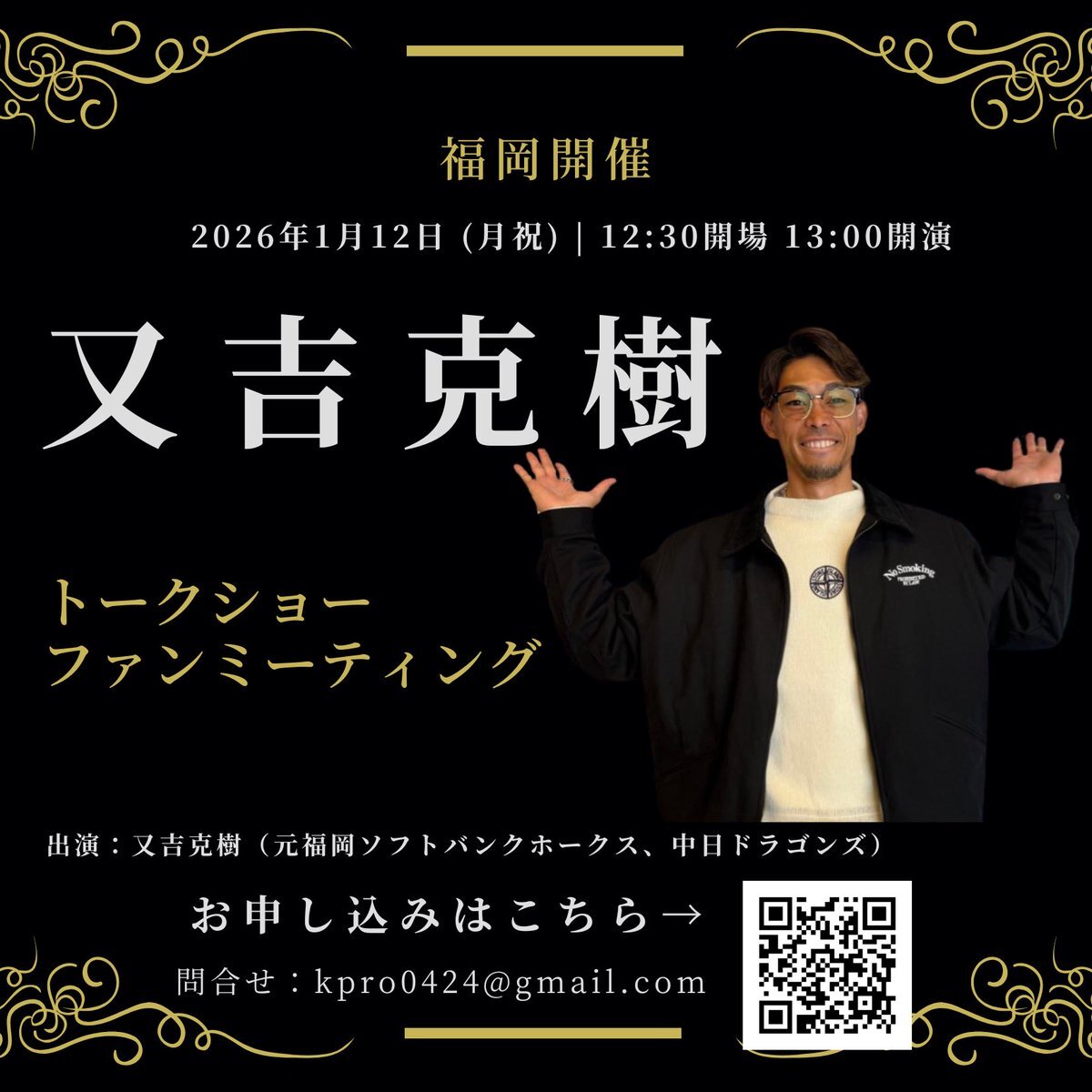 【#又吉克樹 トークショー&ファンミーティングin #福岡 開催決定!】 直筆サイン会&2ショット撮影会のオプション付き、その他質疑応答タイムなど内容盛り沢山🔥 お申し込みは👇 forms.gle/DZakFvqo5zzXR4… #福岡ソフトバンクホークス pic.x.com/jHs10eggMi