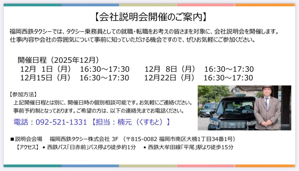 【会社説明会開催📢】 福岡西鉄タクシーでは毎週会社説明会を実施します! 📞092-521-1331(楠元) 仕事内容や会社の雰囲気を知りたい方、ぜひご参加下さい。 #福岡求人 #タクシードライバー募集 #正社員 #西鉄タクシー #会社説明会 #求人情報 pic.x.com/XeDPgHlLKn