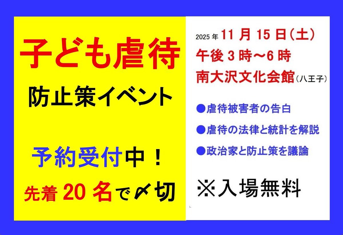 子ども虐待防止策イベント in 八王子 2025 最後の『子ども虐待防止策イベント』へ、あなたも今すぐメール予約を!✨ #防止策イベント2025 #毒親育ち #虐待 #タコピーの原罪 #家出 #ネグレクト #少年院 #いじめ #子ども食堂 #政治 #福祉 hachioujipc.blogspot.com/2025/09/blog-p… pic.x.com/jBTm1AxcfA