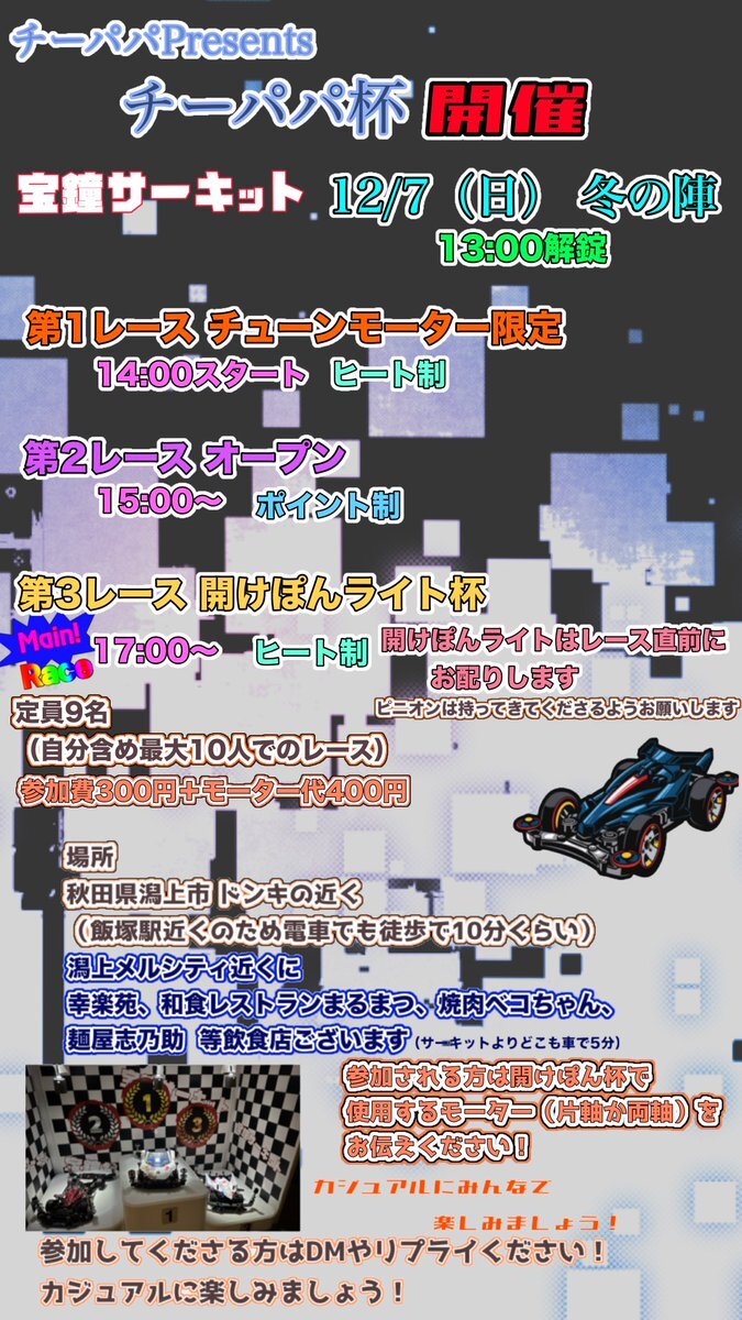 12/7(日)にレース開催します! チーパパ杯! 13時より解錠、14時スタートです! 10人募集いたします!参加したい方はお声かけください! #ミニ四駆 #秋田 #潟上 pic.x.com/XOmFEQTrdq