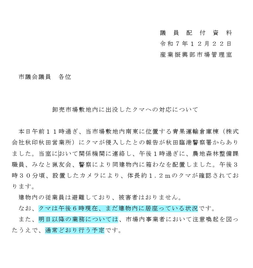 卸売市場にクマ。 クマ対応慣れてきた…の? #クマ #秋田 #秋田市 > クマは午後6時現在、まだ建物内に居座っている状況です。また、明日以降の業務については、市場内事業者において注意喚起を図ったうえで、通常どおり行う予定 ▼ ツキノワグマ捕獲情報等 city.akita.lg.jp/bosai-kinkyu/1… pic.x.com/AQNfTvleDS