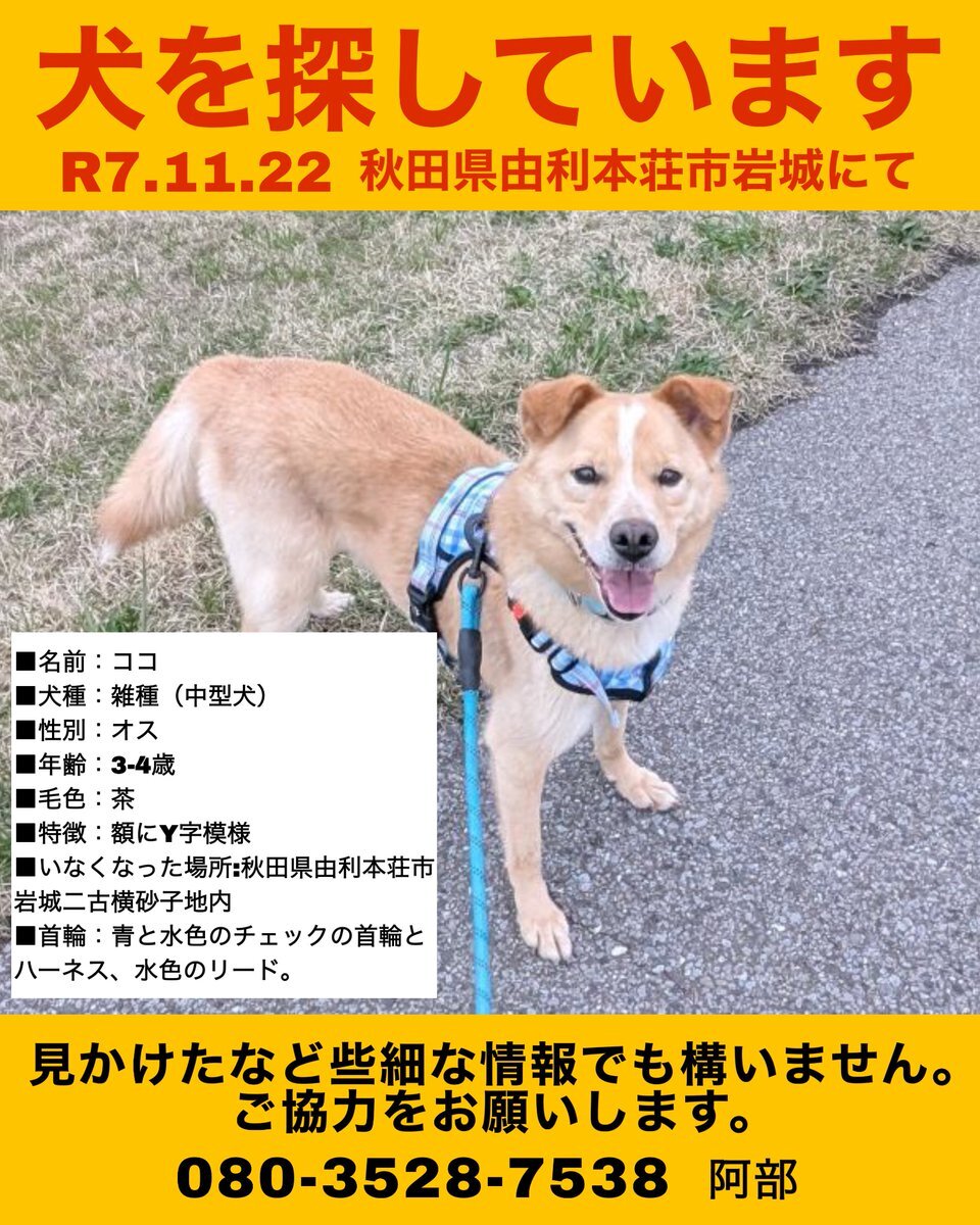 知人宅の犬が迷子になってしまいました。 見かけた方は些細な情報でも構いません。ご連絡をお願いいたします。 人馴れしているので名前を呼んだら保護も出来るかと思います。 警察・保健所には連絡済みです。 #迷子犬 #秋田 #迷い犬 #犬 #拡散希望RTお願いします