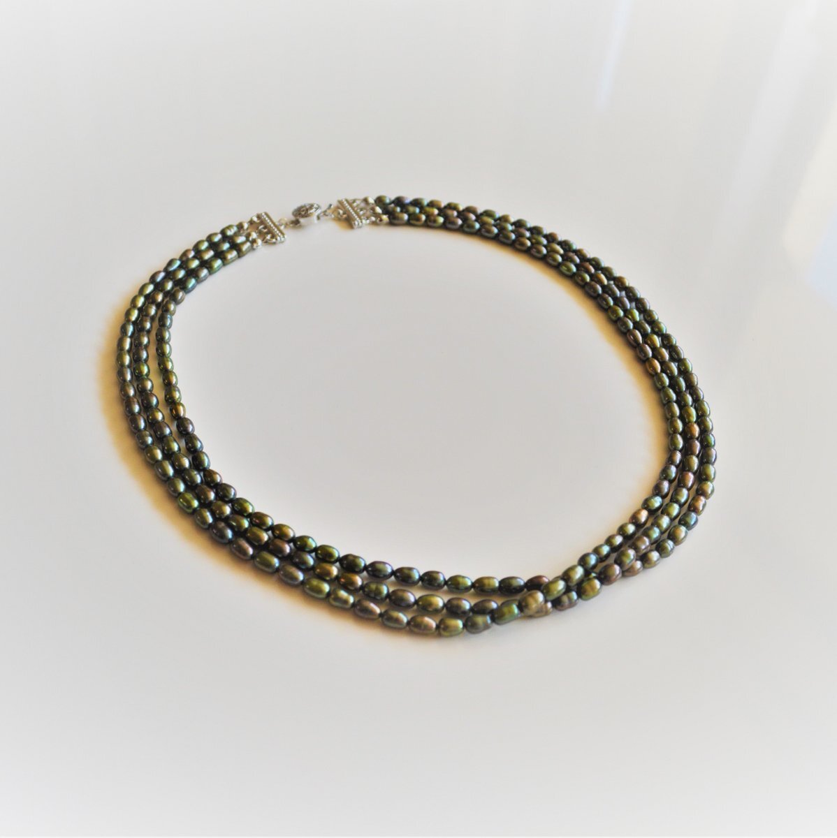 艶やかなピーコックグリーンの #淡水パール を繋いだ3連 #ネックレス です✨ ころんとした可愛らしいバロックの #パール を使ったので、柔らかな雰囲気🍀 きちんとした印象で、普段のお出かけから少しかしこまったお席にもお勧めです🎀 🖤🩶Creemaで販売中🩶🖤 creema.jp/item/19672477/… #真珠 #秋 pic.x.com/U9Le9RdMod