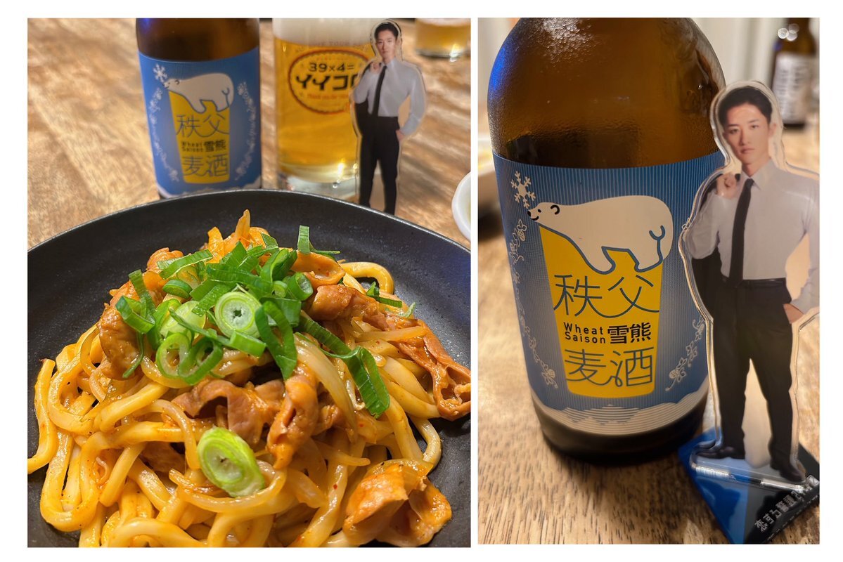 秩父で買ってきたホルモンで焼きうどん作りました😊 秩父麦酒 Wheat Saison雪熊もフルーティーでおいしかった🍻 #じぶんを主語に_秩父 #特急ラビュー #西武鉄道 #秩父 #岩本照 pic.x.com/XljZT3Mg6O