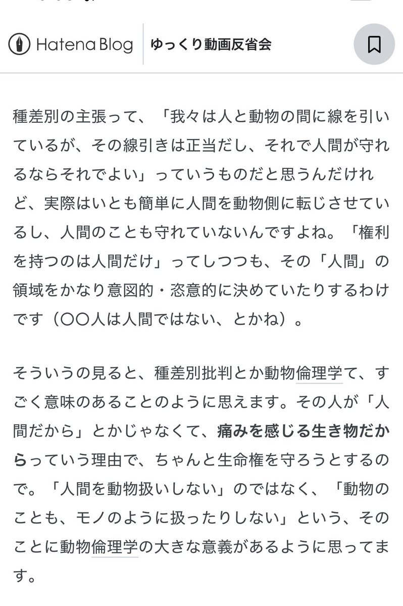 4年ぶりにこちらの動画(Hatena Blogの反省会まで含め)を見返してみて、差別に抗うべきという信念を持っている人にこそ #種差別 のことも知ってほしい、届いてほしいなと改めて思う。 #EndSpeciesism #種差別を終わらせよう #あらゆる差別に反対します pic.x.com/ozRZOBJKps