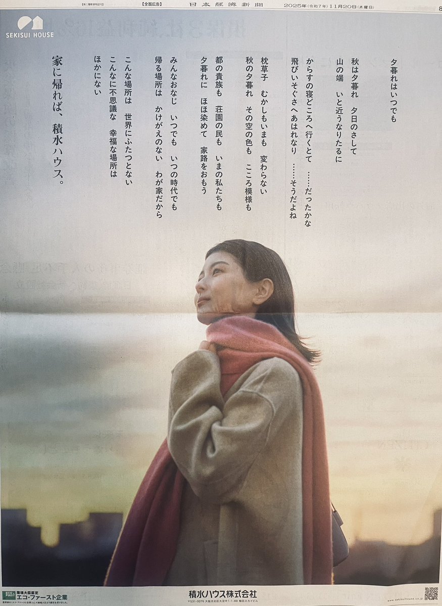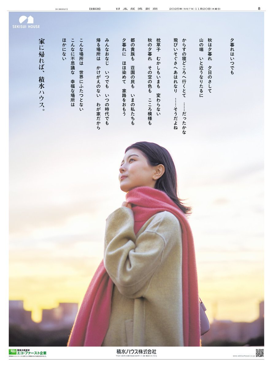 11/20掲載 #積水ハウス の広告です。 秋の夕暮れの空を見上げる女性。 枕草子にあるように、むかしもいまも夕暮れに家路をおもう気持ちは変わりません。 かけがえのないわが家という帰る場所がある幸せを表現しています。 Webサイトはこちら sekisuihouse.co.jp #日経 #新聞広告 pic.x.com/uGL911lbJg