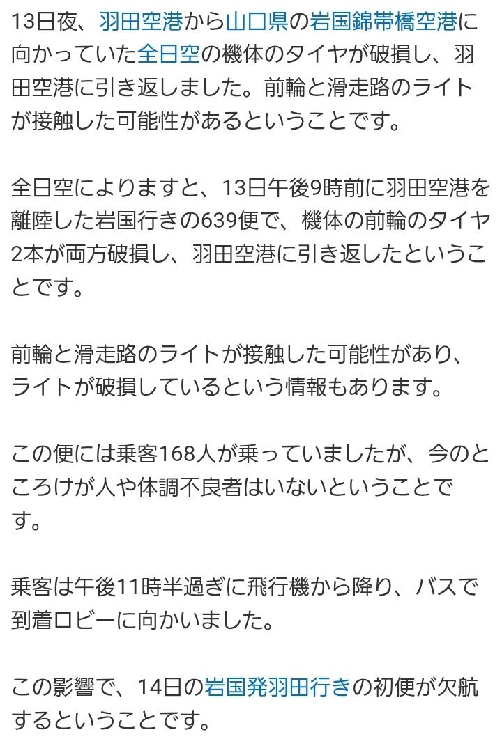 10/13(月) 羽田発 岩国錦帯橋空港(山口県)行き ANA機 前輪と滑走路のライトが接触した可能性があり、前輪を2本破損 羽田へ引き返す news.yahoo.co.jp/articles/aa88b… #飛行機 #航空機 #事故 #トラブル #不具合 #接触事故 #引き返す #羽田空港 #全日空 x.com/aoisora139peac…