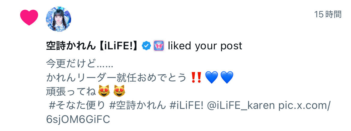 今更だけど…… かれんリーダー就任おめでとう‼️💙💙 頑張ってね😻😻 #そなた便り #空詩かれん #iLiFE! @iLiFE_karen pic.x.com/6sjOM6GiFC